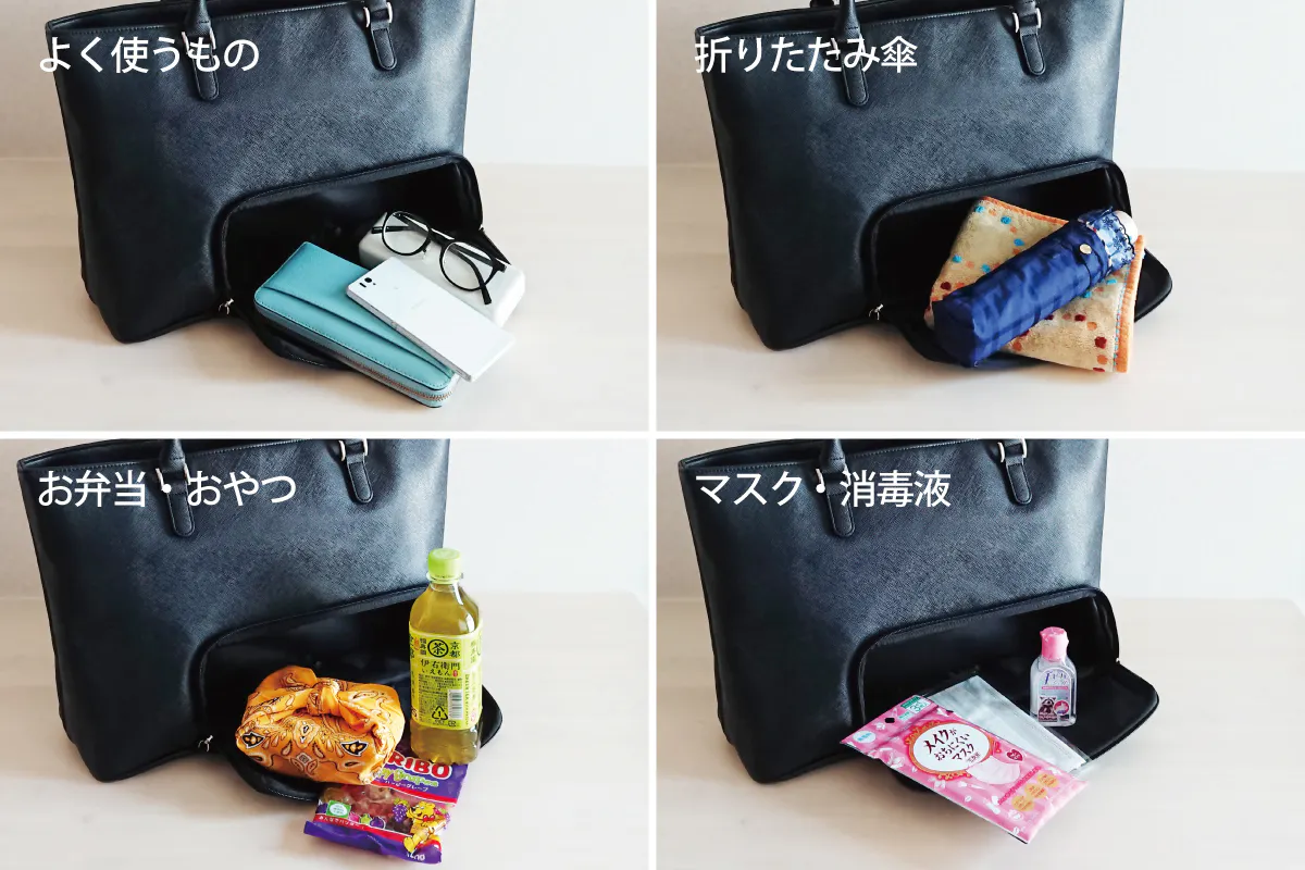 マスクや消毒液を入れておくと、バッグの中身に触れることなく衛生的に使うことができます。