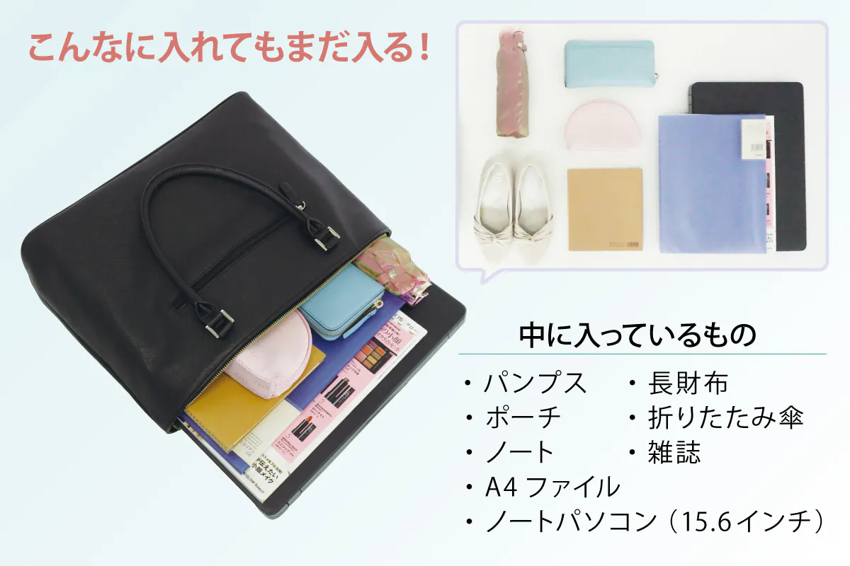 A4ファイル、角2封筒、15.6インチのノートパソコンがすっぽり入るワイドサイズです。