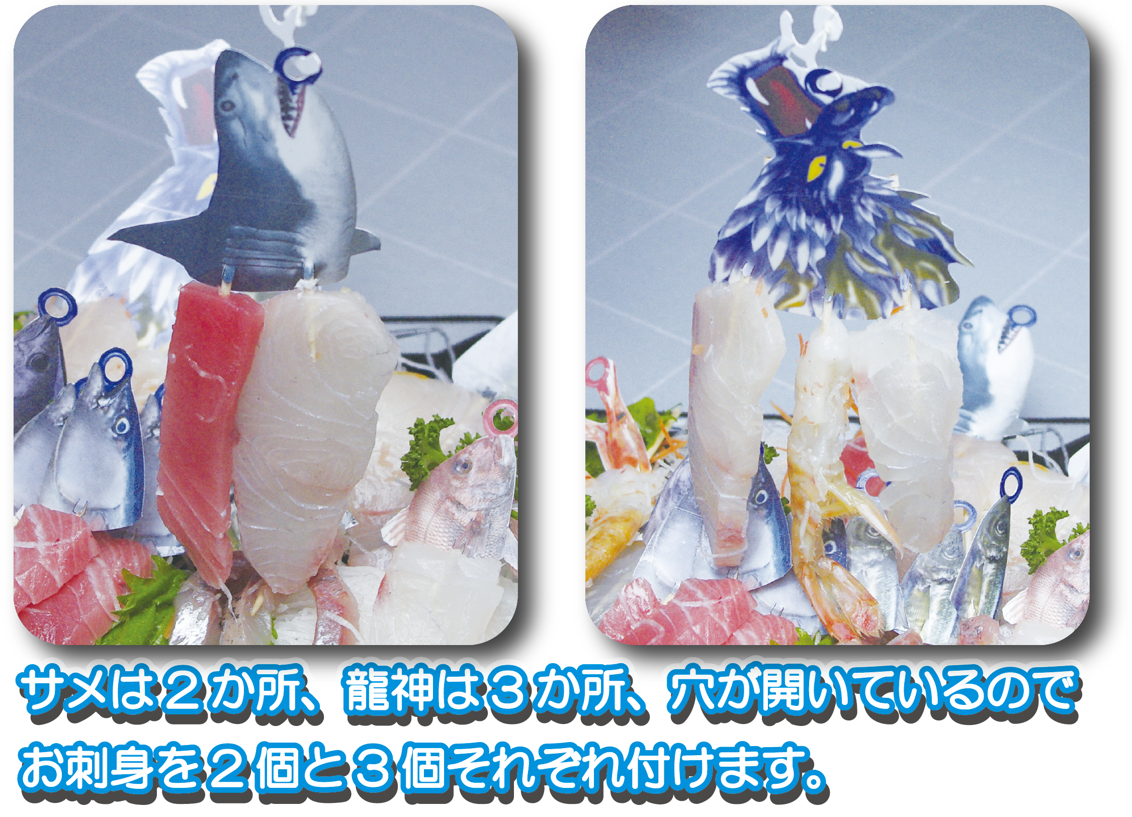 サメは二つ、龍神は三つ刺身を付けることができますので、釣った人はいっぱいお刺身を食べることができます。
