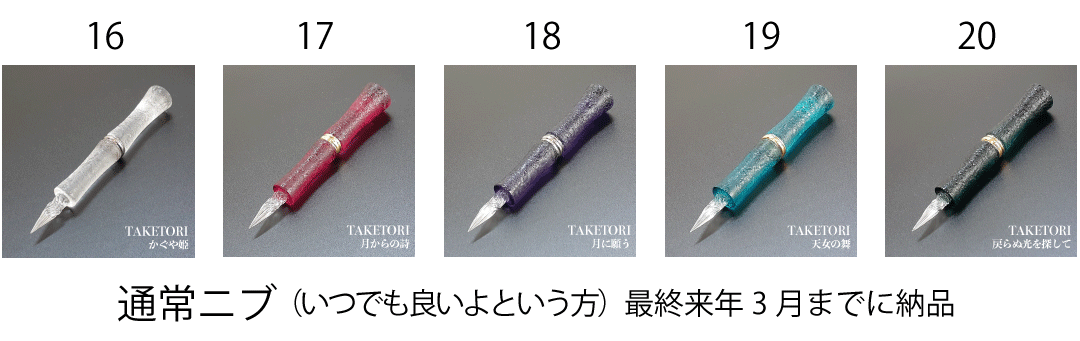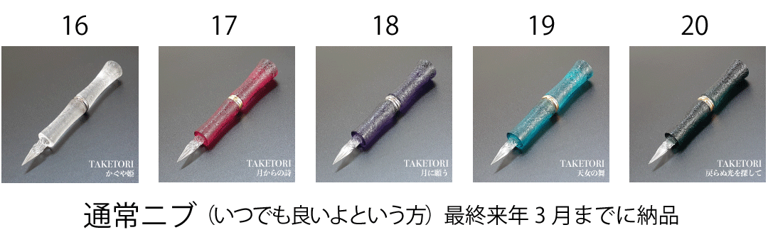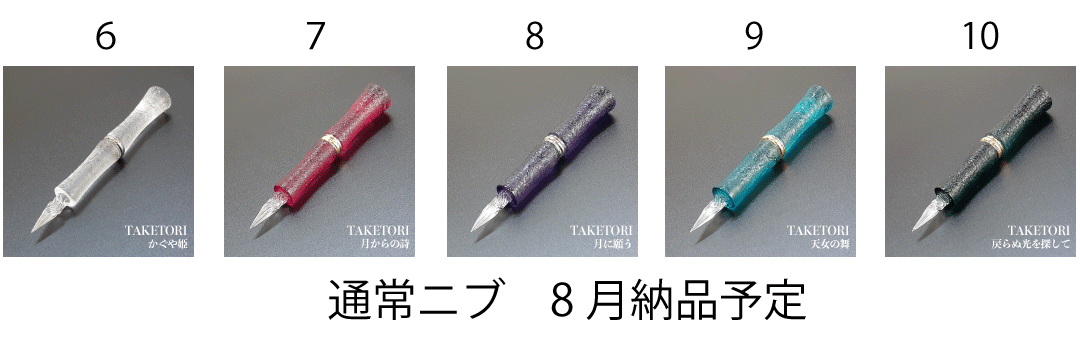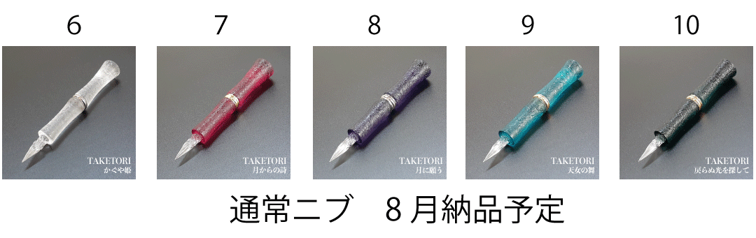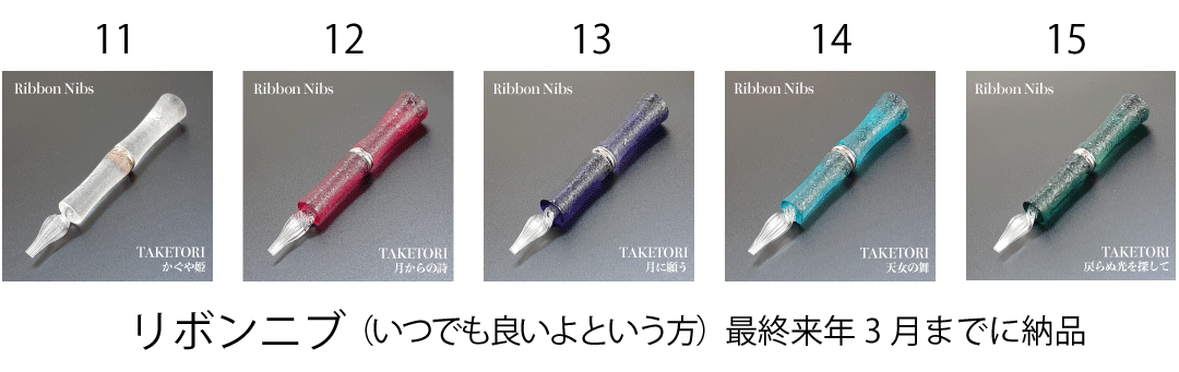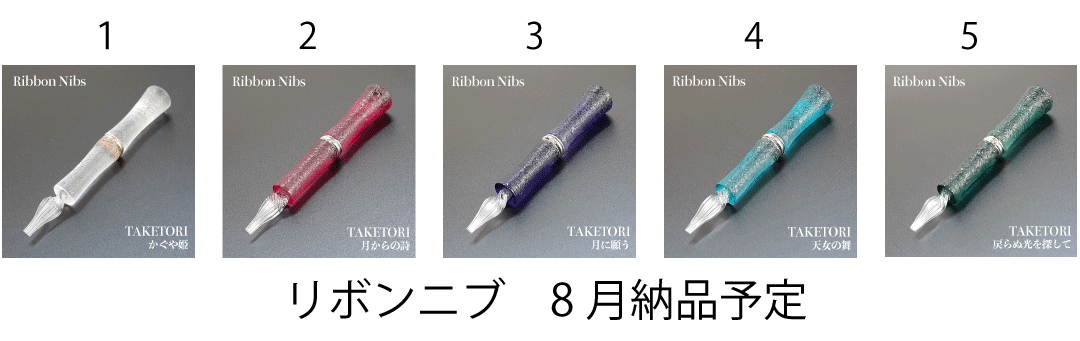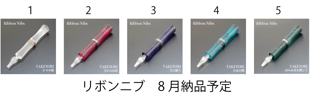 今回のリターン品のガラスペンは通常ニブ・リボンニブと選べ字幅も調節いたします。こちらは8月納品を予定しています。
