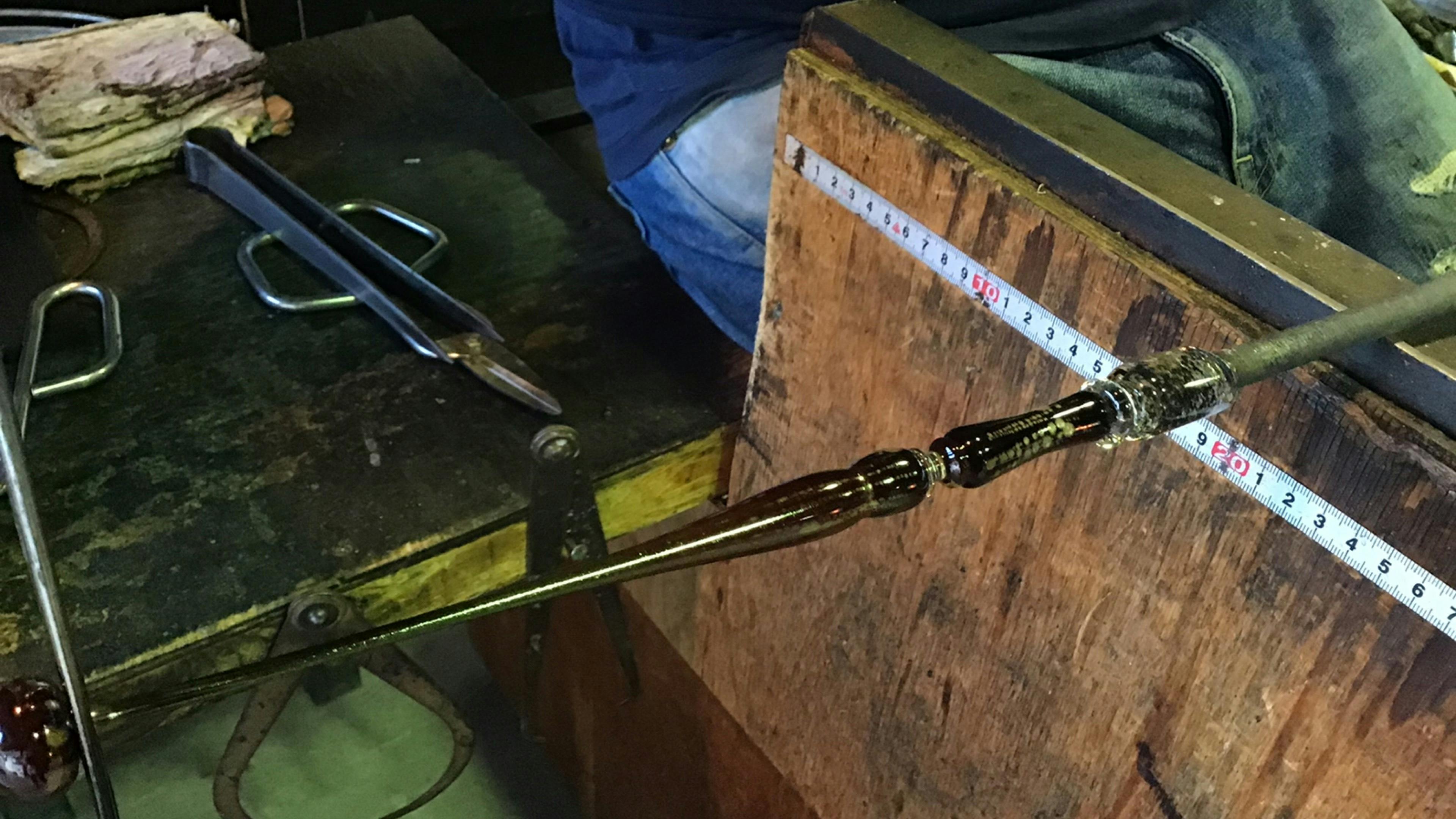 吹きガラスで作るガラスペンは、120cm程のステンレス棒に溶解炉で溶けたガラスを巻き付け作っていきます。ワイングラスのステム(脚)を作る要領で軸を作り、ペン先と溶着し完成させていきます。