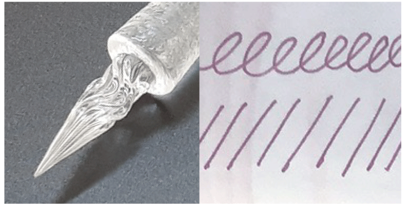 通常ニブ(普通のペン先) 通常のガラスペンの尖ったペン先で万年筆用インクでボールペンなどと同じような文字が書けます。リターン品では字幅を0.3mm〜0.8mmの間で調節します。