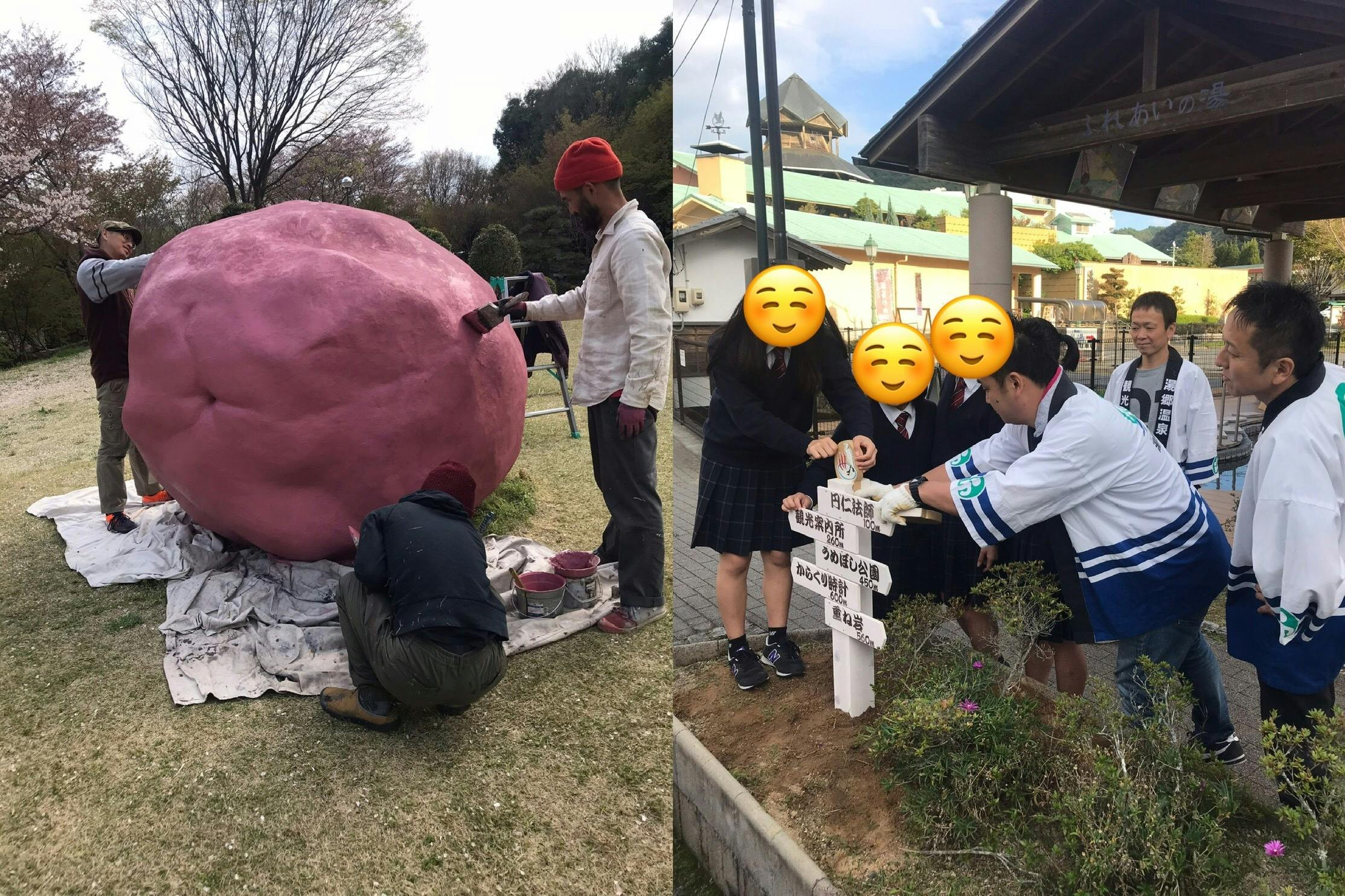 温泉街にアートイベントを仕掛けて温泉街の温泉旅館に60名以上のガラス作家さんの展示イベントや、公園にオブジェ(銀座外壁オブジェでコラボした佐藤氏に制作依頼)設置などアート的な取り組みから、地元高校生と協議しながら案内看板を立てたり草刈りなどの美化活動をして楽しみながら湯郷温泉を良い街にしたく取り組んでいます。