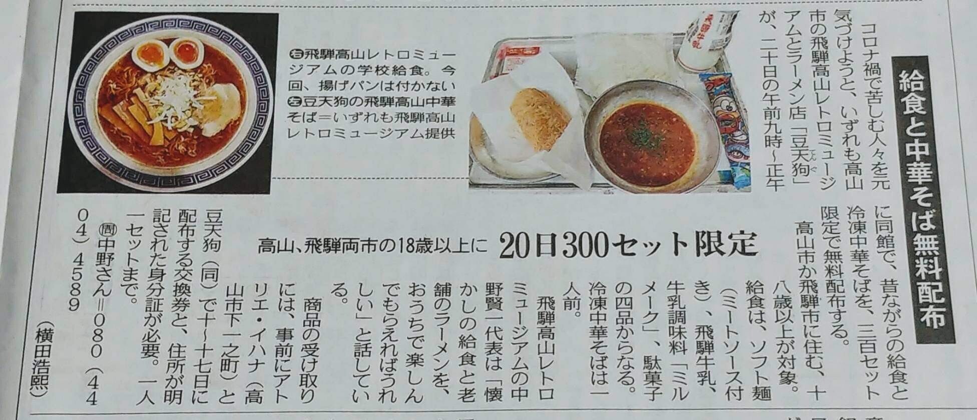 2021/02/11 09:00おはようございます。ご支援いただきました方、誠に有難うございます。2月20日の9:00~正午に、飛騨高山レトロミュージアム様にて、昔ながらの給食と、豆天狗の冷凍中華そばをお配り致します。 今回、飛騨高山レトロミュージアムの中野様より、クラウドファンディングを通じて、豆天狗の現状を知っていただき、300食分のご支援をいただき、お配りいただきます。 豆天狗はお手伝いしか協力ができず、お恥ずかしい限りですが、是非、この機会にご利用下さいませ。引換券は2月17日まで「アトリエ・イハナ」と「豆天狗」にてお配りしております。 中野様には本当に感謝しかありません。心意気と男気が素晴らしく、感激致しました。 皆様にもご支援や励ましの御言葉をいただき、毎日、心が動かされております。本当に有難うございます。 私も貢献ができる人間、会社創り目指し、コロナ禍を乗り越えます。 豆天狗 清水將行 もっと見る