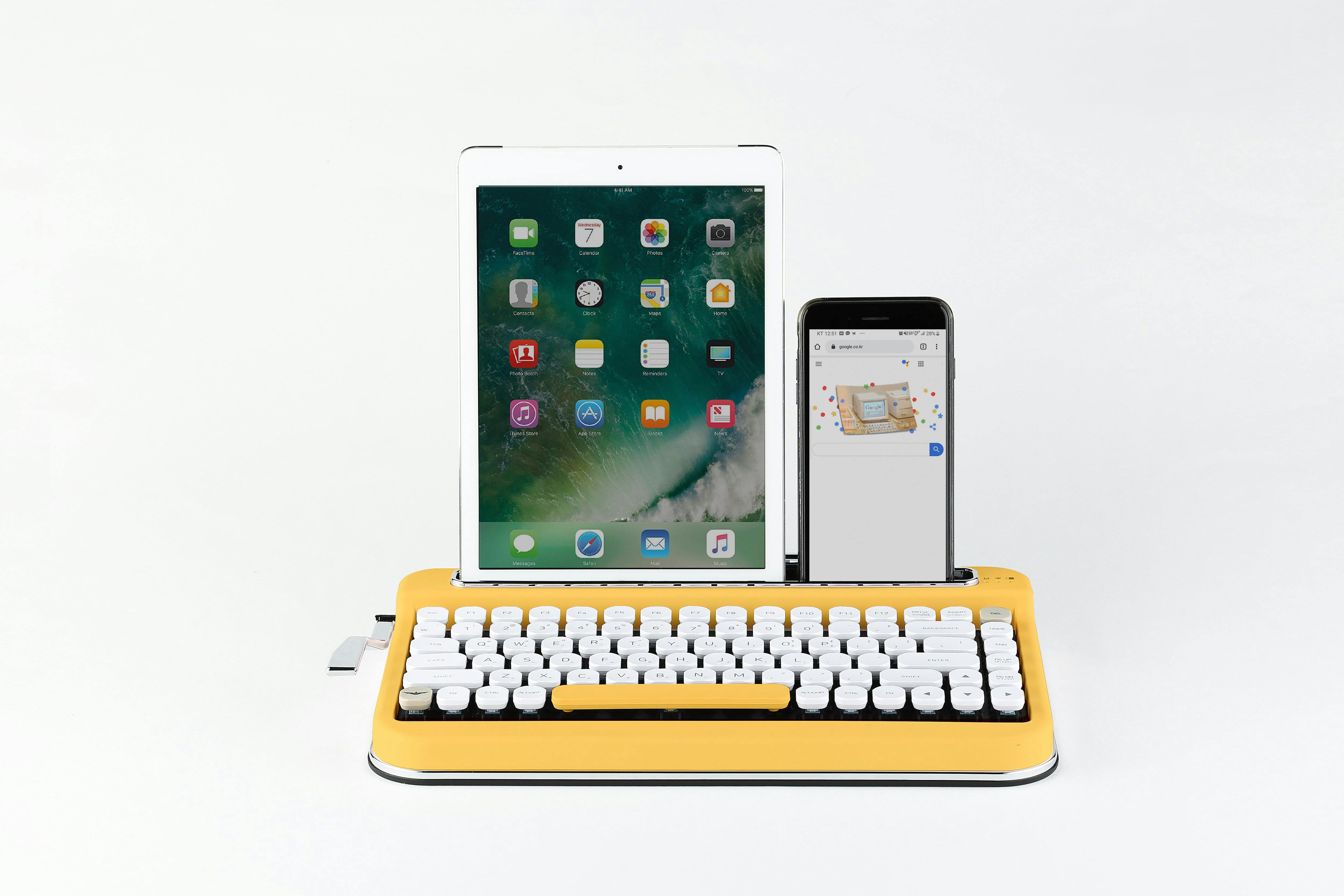 PENNA YELLOWキーボードには上端部のスタンドが付いていて、様々なデバイスをタイプライターのように使うことが出来ます。