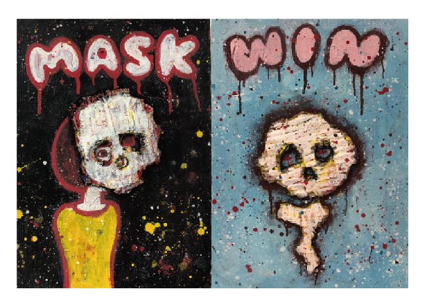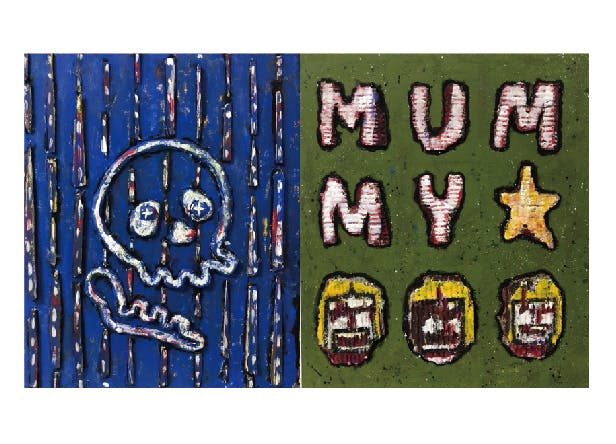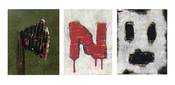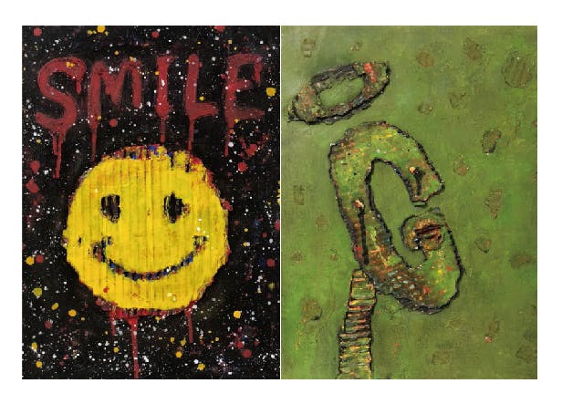 絵の具だけでなく、段ボールや端材などその辺に落ちているものの素材を活かして創作しています。紙やすりや火などを使い、エージング加工を行い作品を仕上げています。