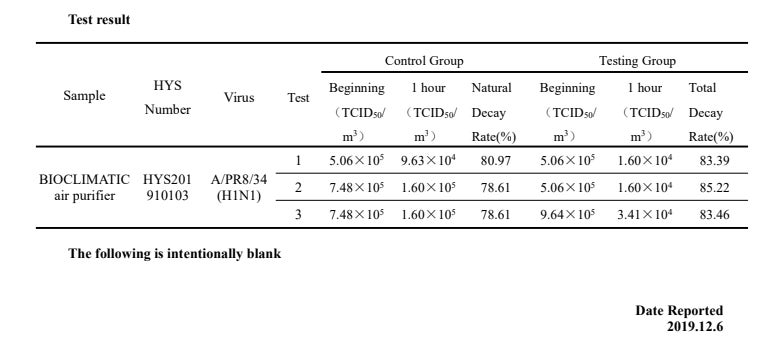 A/PR8/34(H1N1型)のインフルエンザウイルスは83〜85%以上の除菌に成功しています。
