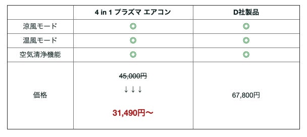 「4 in 1 プラズマ エアコン」は空気清浄と冷暖房が備わった多機能なエアコンでありながら、他の類似製品と比較してほぼ半額の低価格を実現しました。
