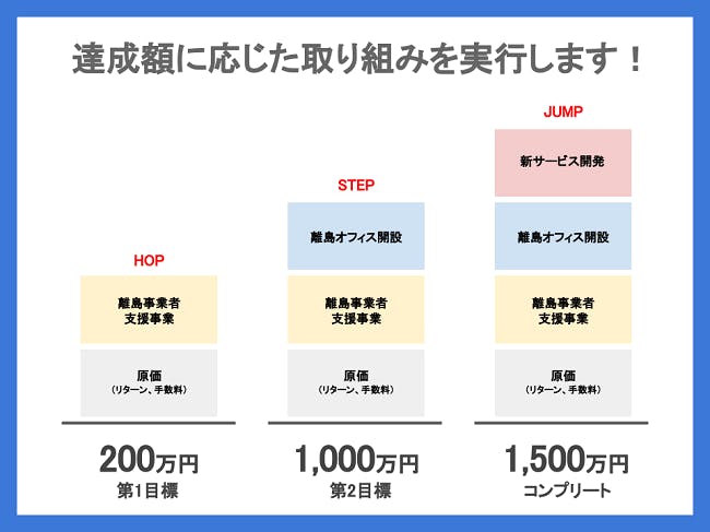 ご支援いただいた目標額に応じて、一歩ずつ私たちの夢を実現させていきます。