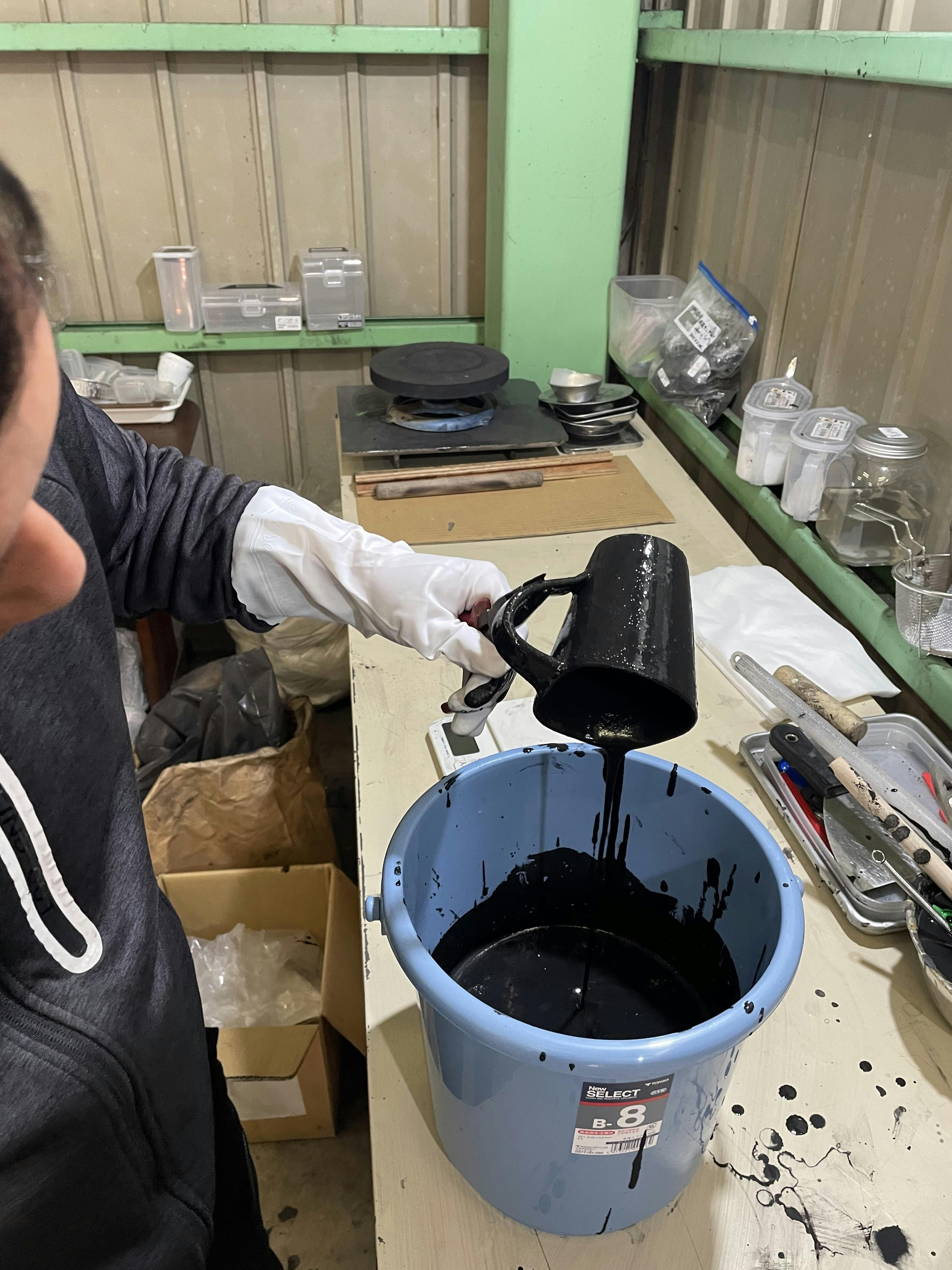 :炭釉薬をかけ乾燥した後、下地材を表面にかけて乾燥して焼成すればできます。