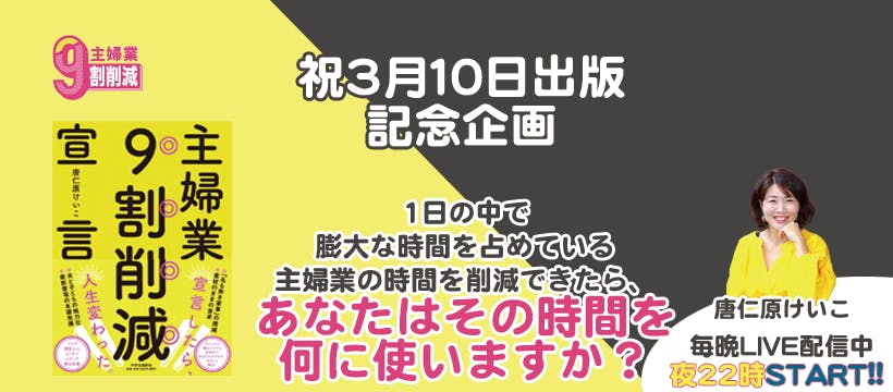 13. 「主婦業9割削減宣言」100冊+唐仁原けいことコラボイベント開催権利 ¥188,000