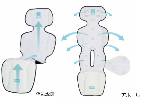 背面に設計されたファンが風を通過する空間を確保し、乳児の頭から背中まで全身に涼しい風を伝達します。今までの製品の中には、ファンが前面に位置しており、またそのファンを隠すために生地を追加するので、円滑に空気を吸い込み、シート全体に空気を送り込むことが困難ものがありました。