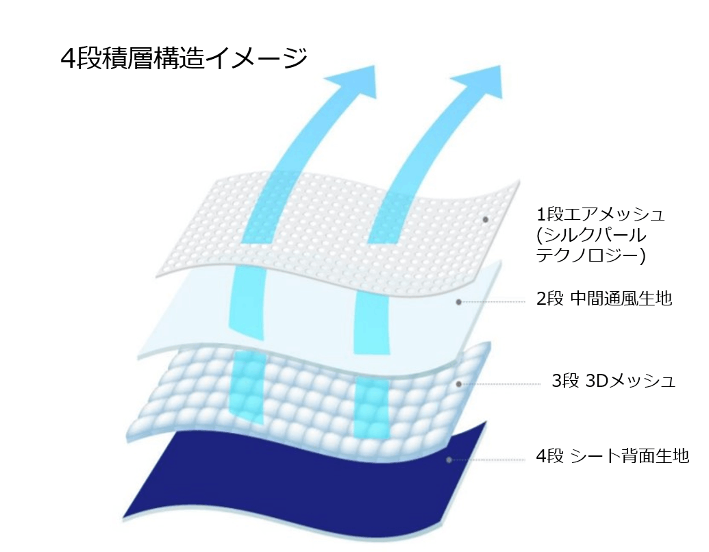 3段:(3Dメッシュ):3次元立体織物で空気の循環がスムーズで汗を素早く冷やして、復元力にもすぐれているために、柔らかなクッション性があり、居住空間を快適にする役割があります。