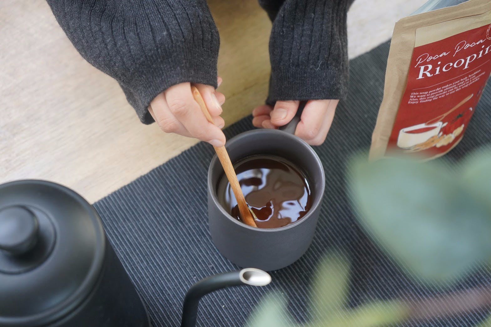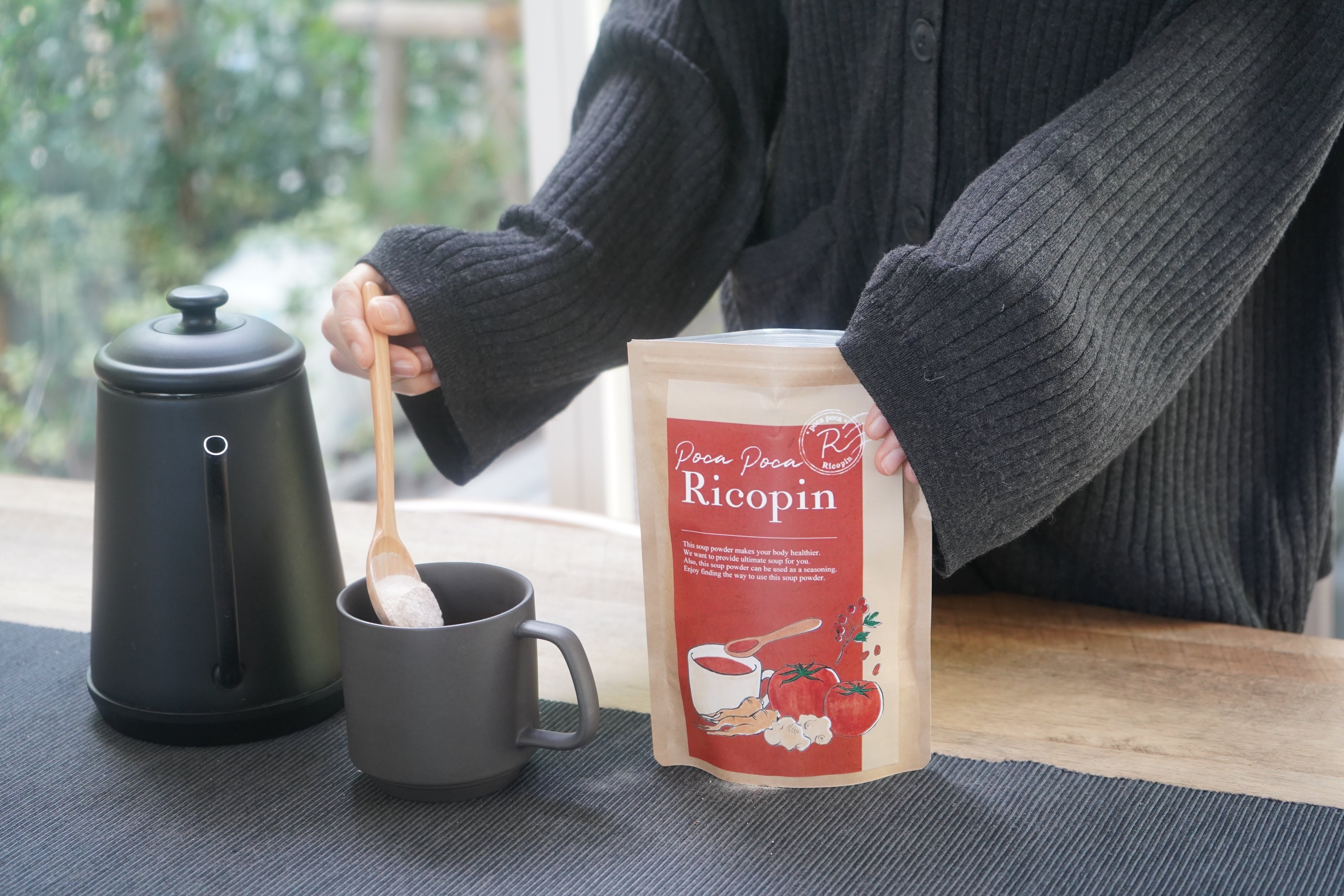 忙しい人も気軽に取り入れられるようパウダー状になっていて、さっとお湯に溶かすだけでスープとして手軽にほっこりと楽しめるように仕上げました。