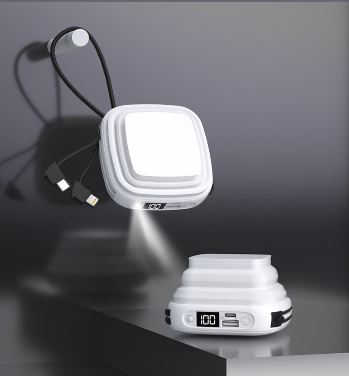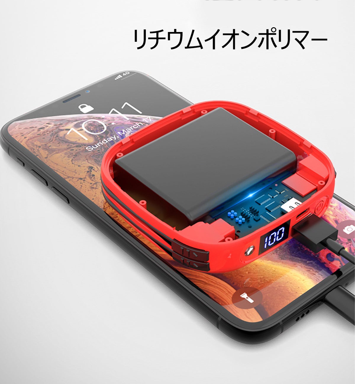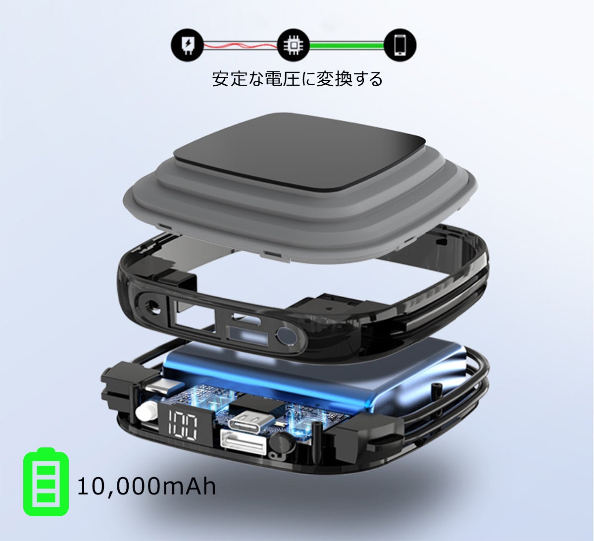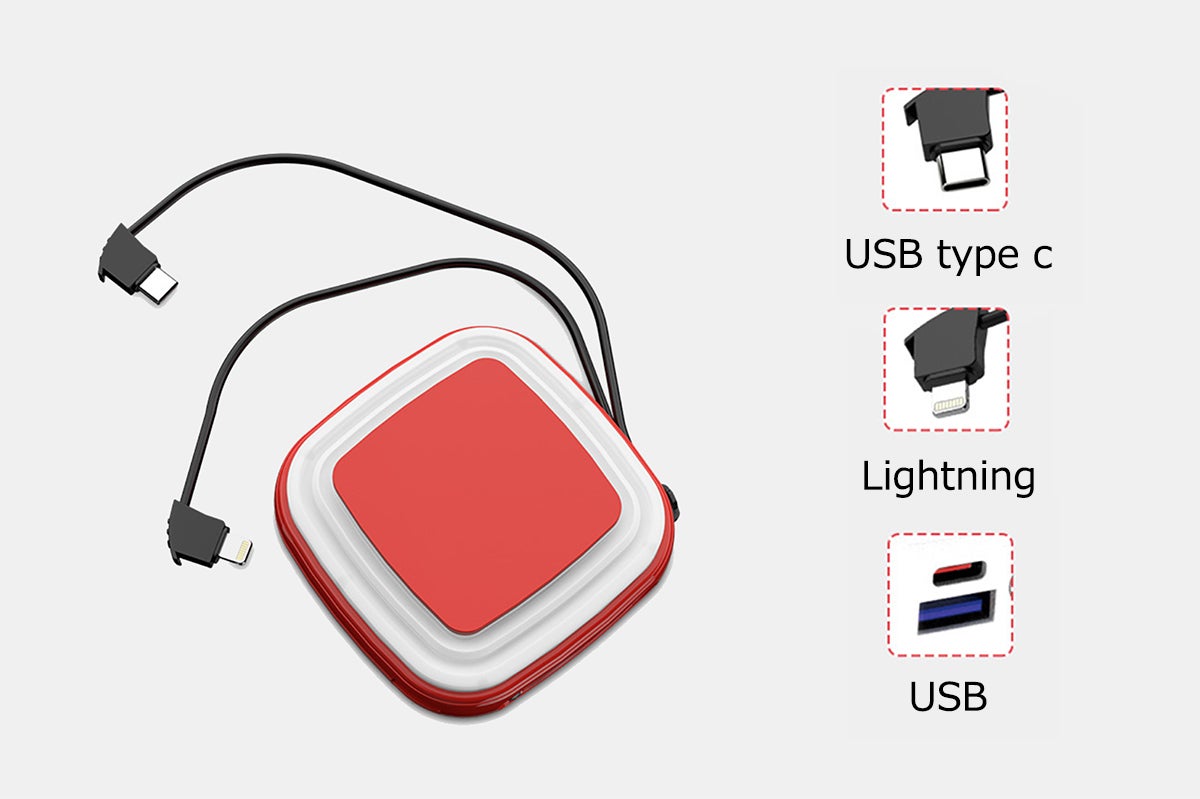 本体の周りに一体化した充電ケーブルはUSB type cとLightningを同時に対応できるため、利用時に面倒な充電ケーブル探しはいりません。