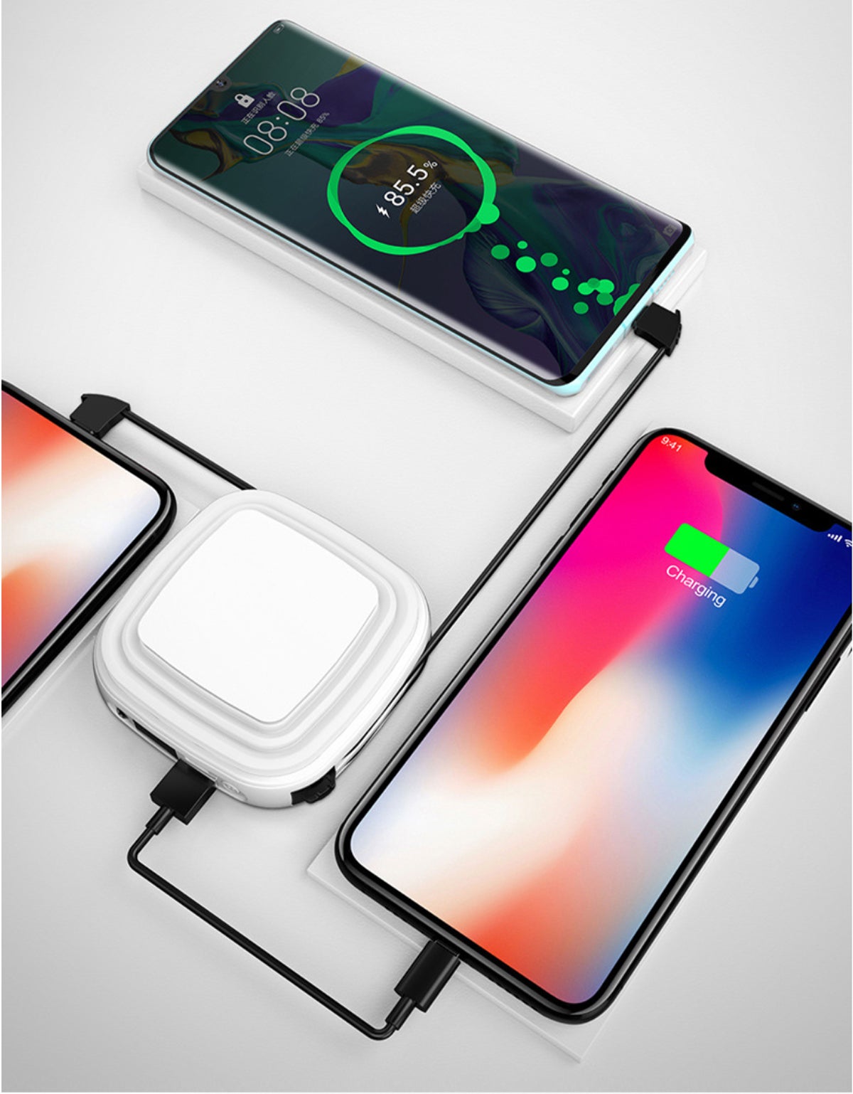本体と一体化した充電ケーブルはデバイスを充電できる以外に、本体から外して、コンセントと接続すれば、本体とデバイスを同時に充電可能。