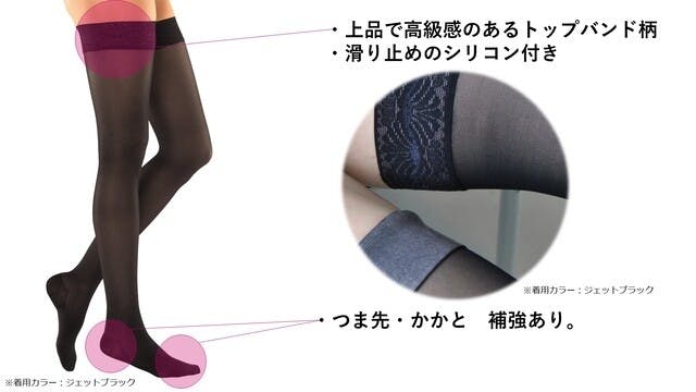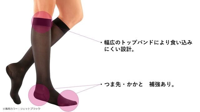 発汗を抑え、そしてお肌を乾燥から守ります。これはスムーズな湿気の放出を可能にする特殊な編み立て技術によって、成し遂げられます。この機能は付加的に、ストッキングの内側の温度調整としても作用します。
