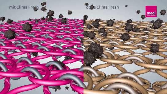 クリマフレッシュとは、使用されている繊維に、抗菌性を持たせる機能のことをいいます。この抗菌機能によって、バクテリアの発生を持続的に抑制し、防臭効果をもたらします。