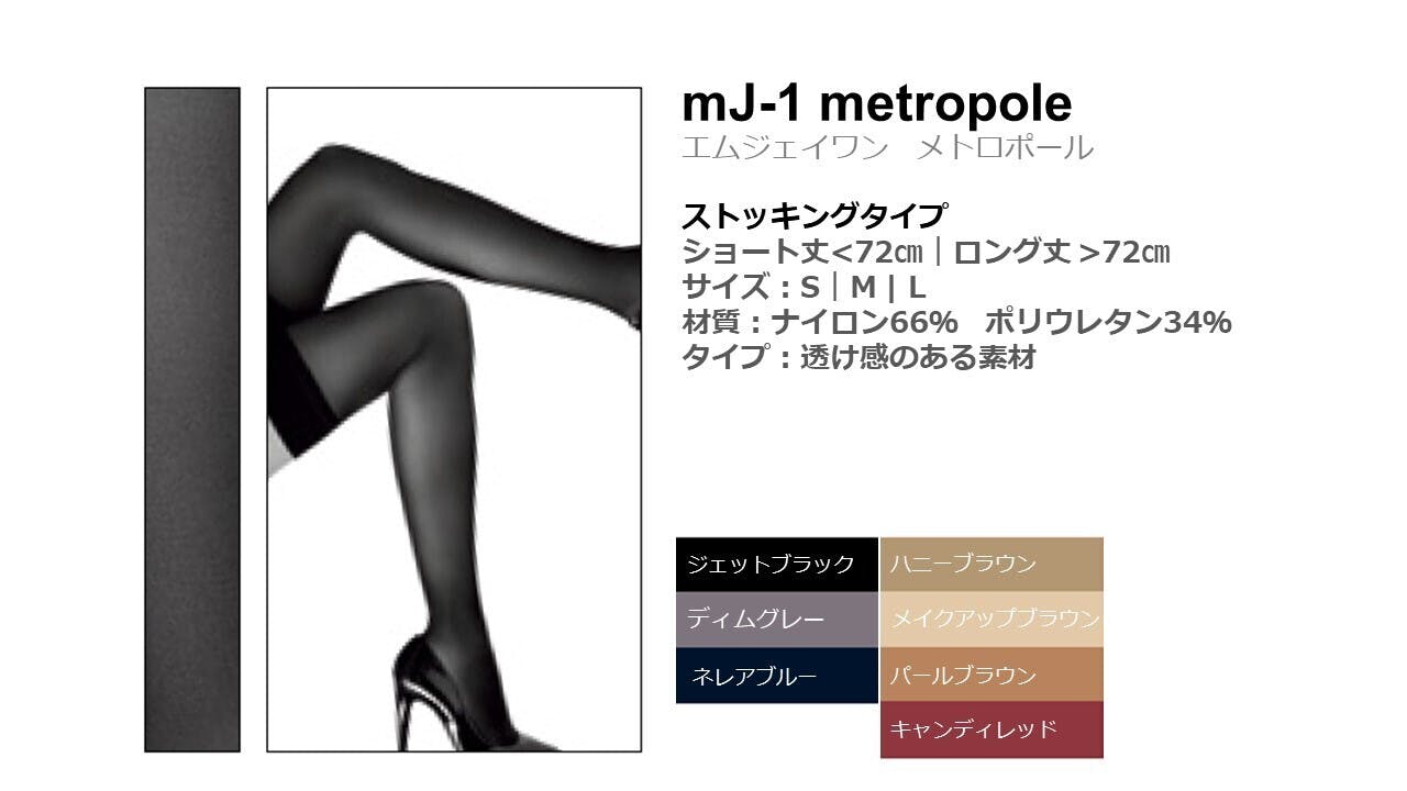 医療用弾性ストッキングの製造で培った技術を活かして創られた繊細さとエレガンスを融合させたmJ-1 metropole。mJ-1 metropoleは、『美しいフォルム』と『着圧』という2つのシンプルな心地よさを追求しました。職人たちの革新的な技術により精密な圧勾配設計がなされ、美意識を高く持つあなたを惹き立てる美しさとそこに込められたラグジュアリーな感覚を感じていただけます。お気に入りのファッション小物のように、毎日身につける楽しみを実感してください。