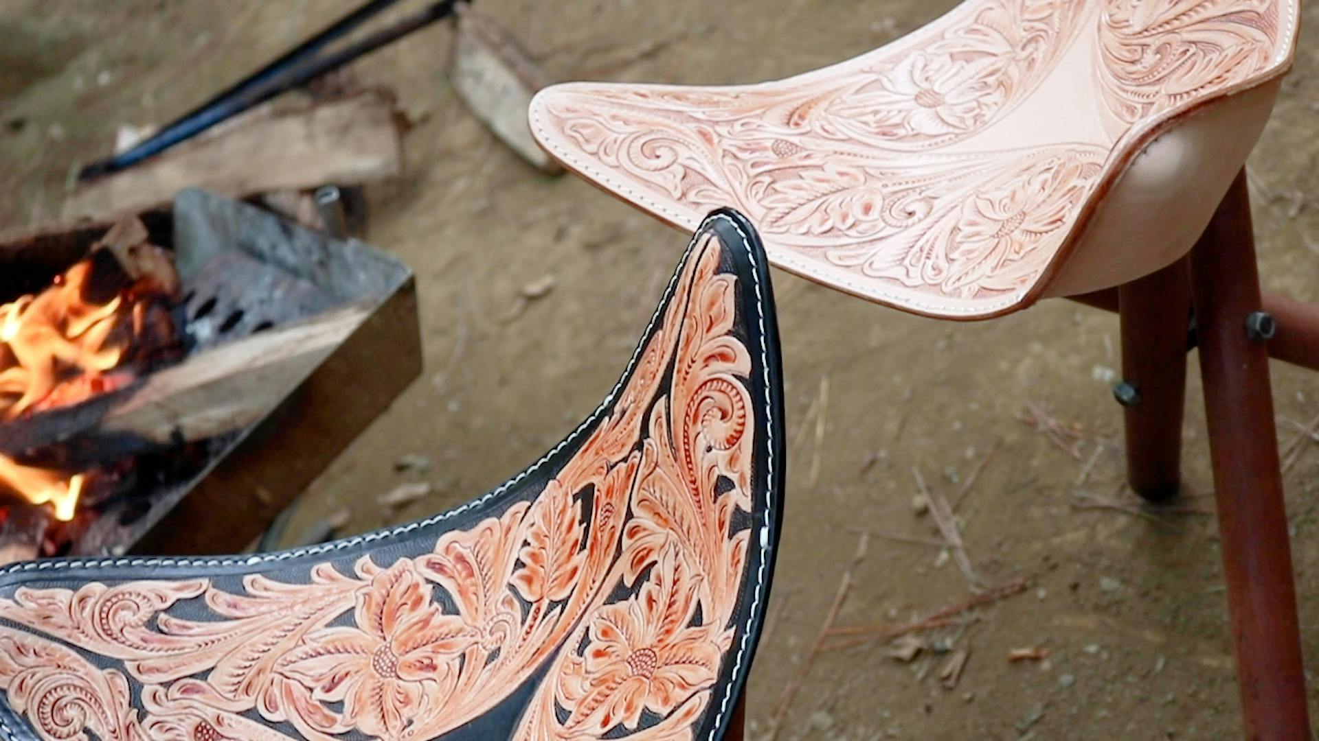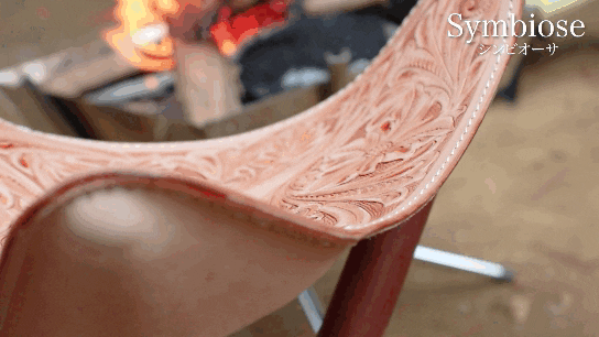 座面には天然皮革である牛本革、脚には天然木・ピンカド材、座面に刻まれた美しいカービング彫刻はボタニカルな植物柄。アウトドアマンと自然との共生、経年変化を楽しめる「天然皮革 × 天然木」のチェアと共に時を刻み生きていくという二つの意味を込めて「Symbiose(シンビオーサ)」と名付けました。