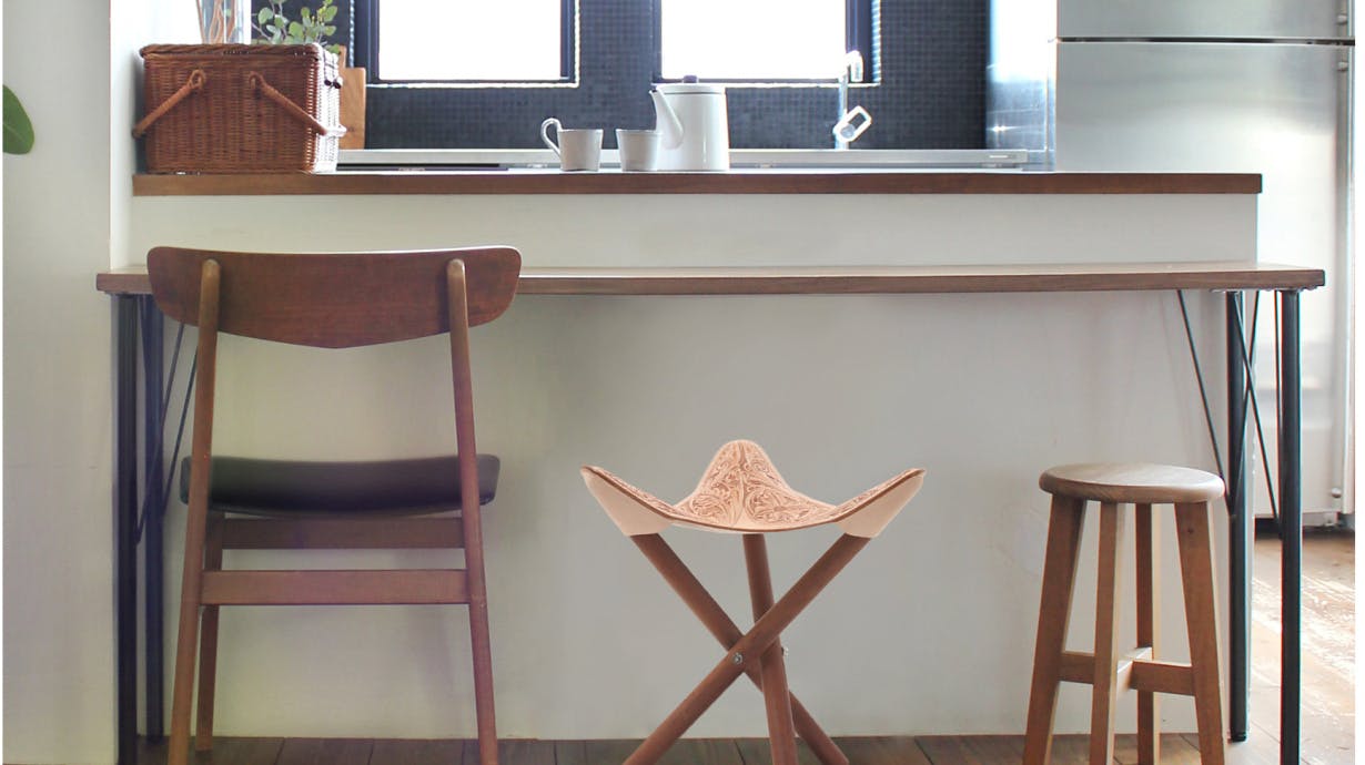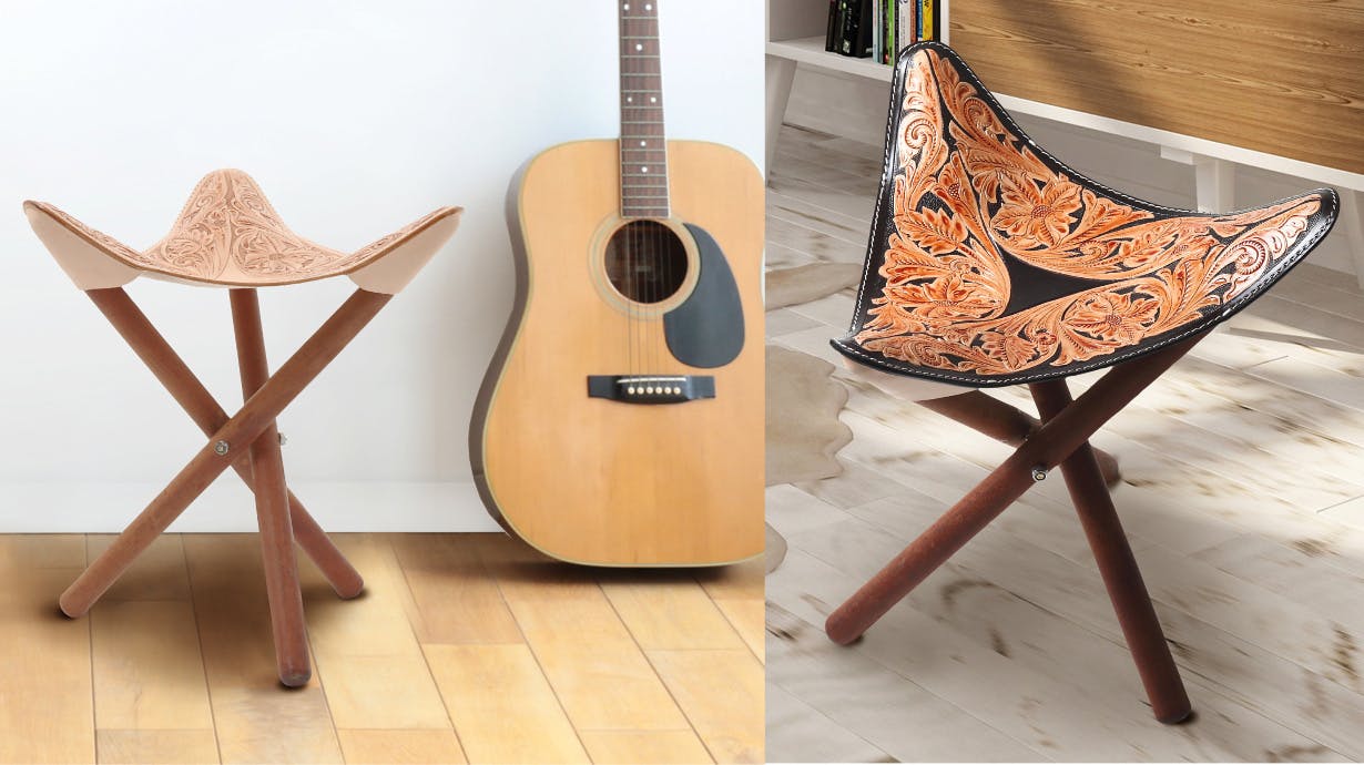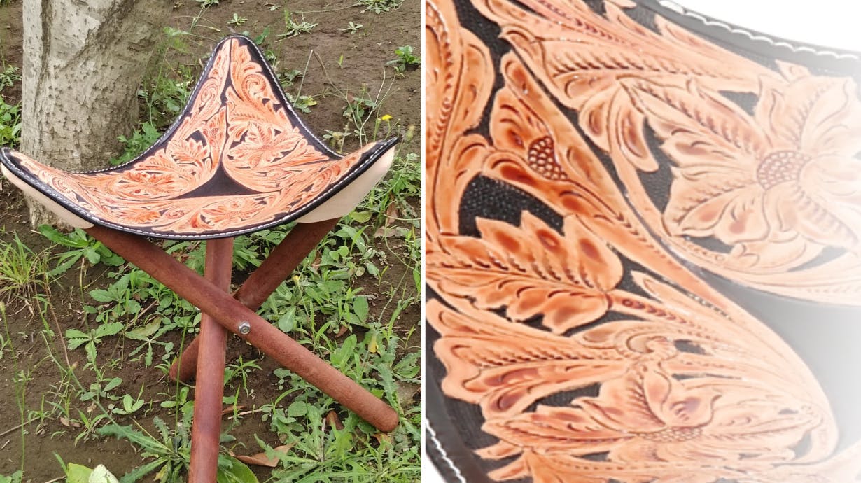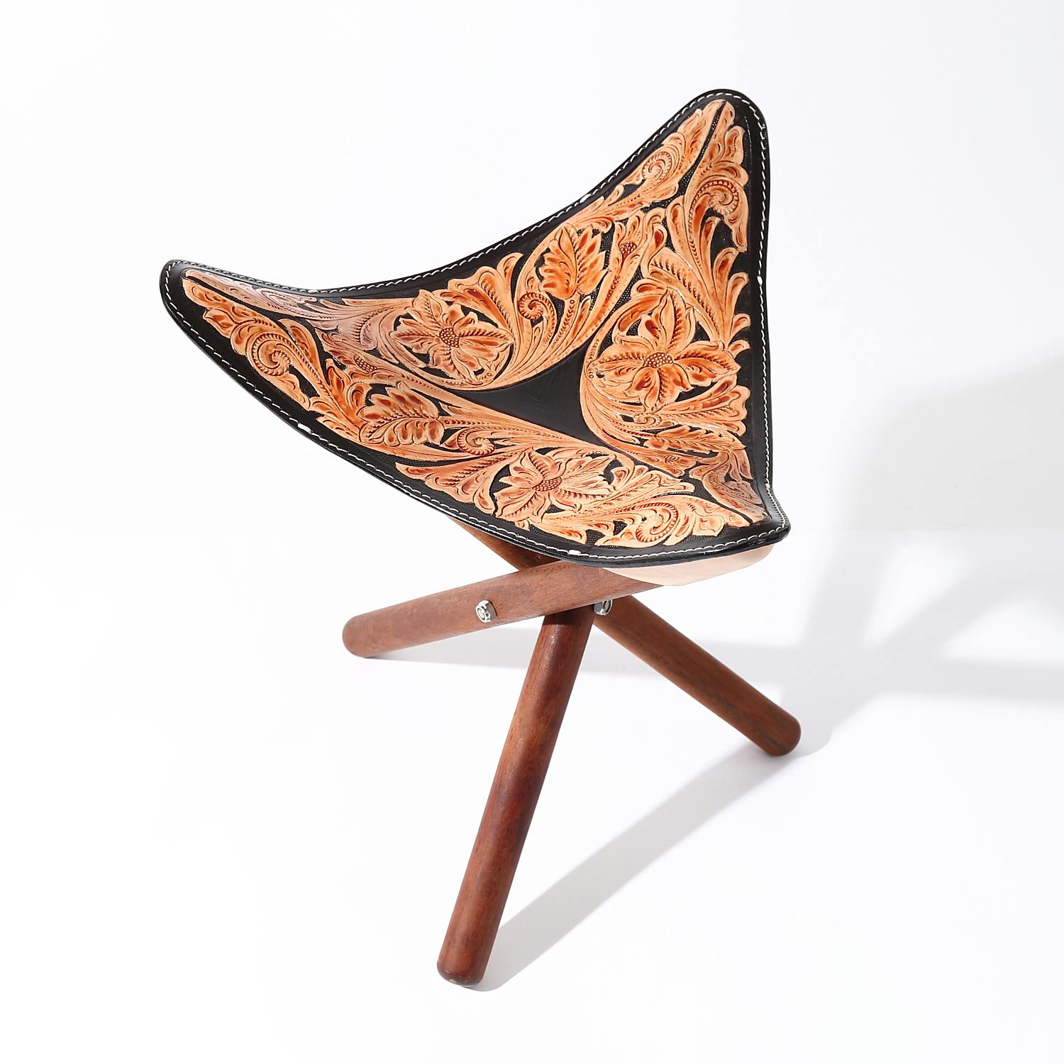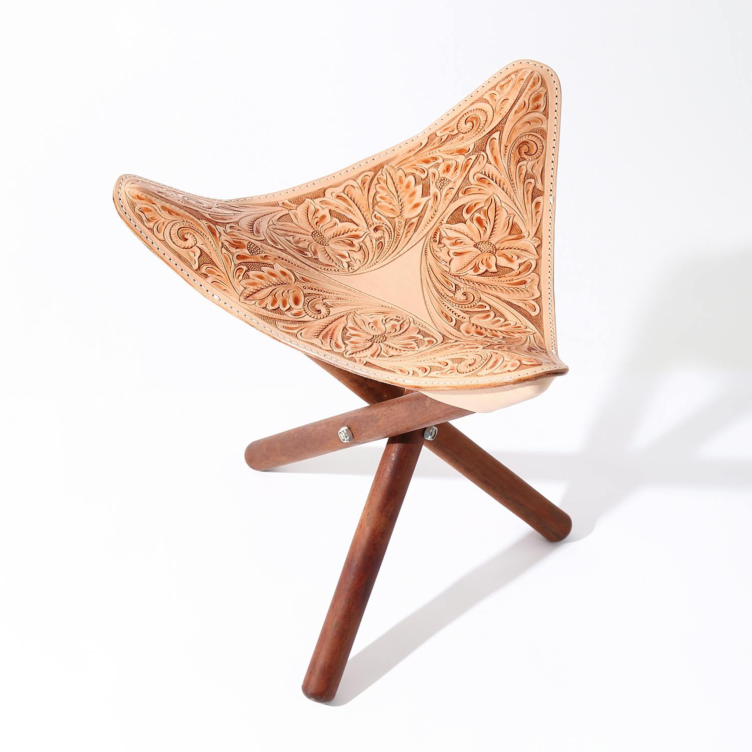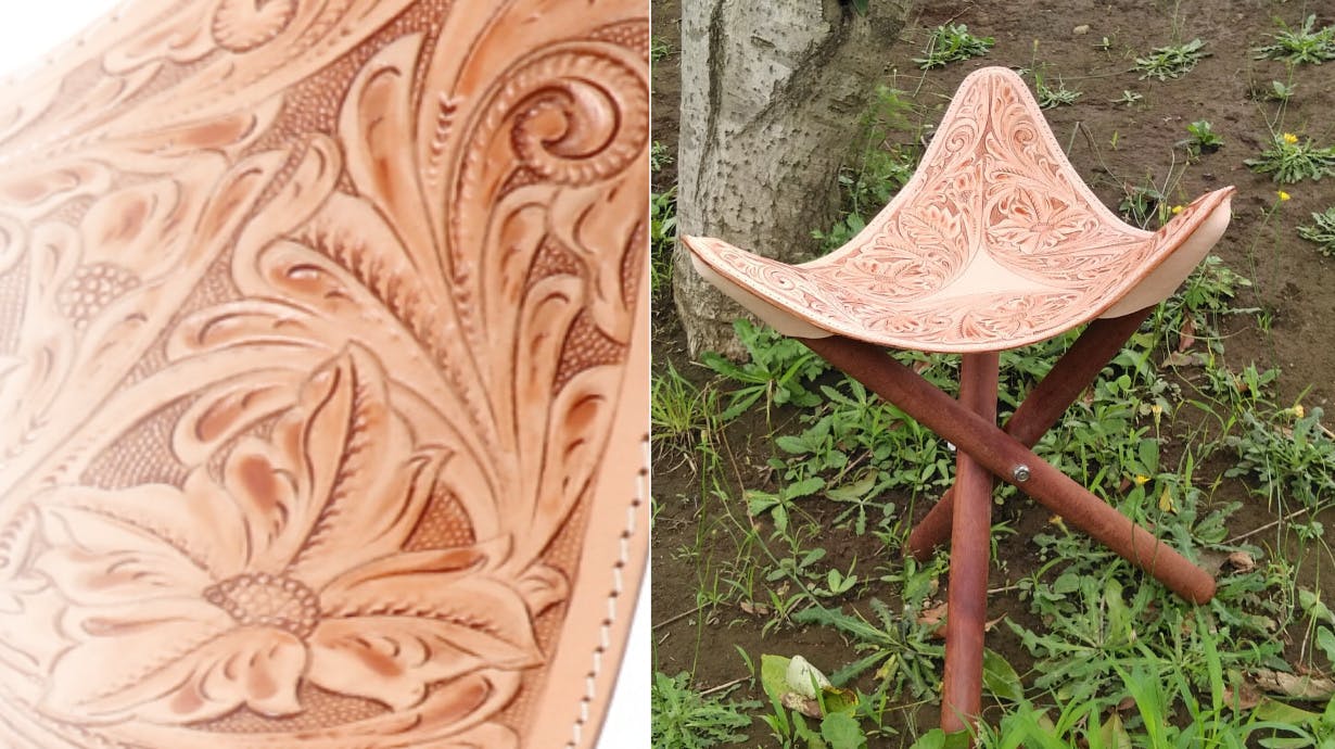 座面には天然皮革である牛本革、脚には天然木・バーミーズアイアンウッド(ピンカド材)、座面に刻まれた美しいカービング彫刻は植物モチーフのボタニカル柄。