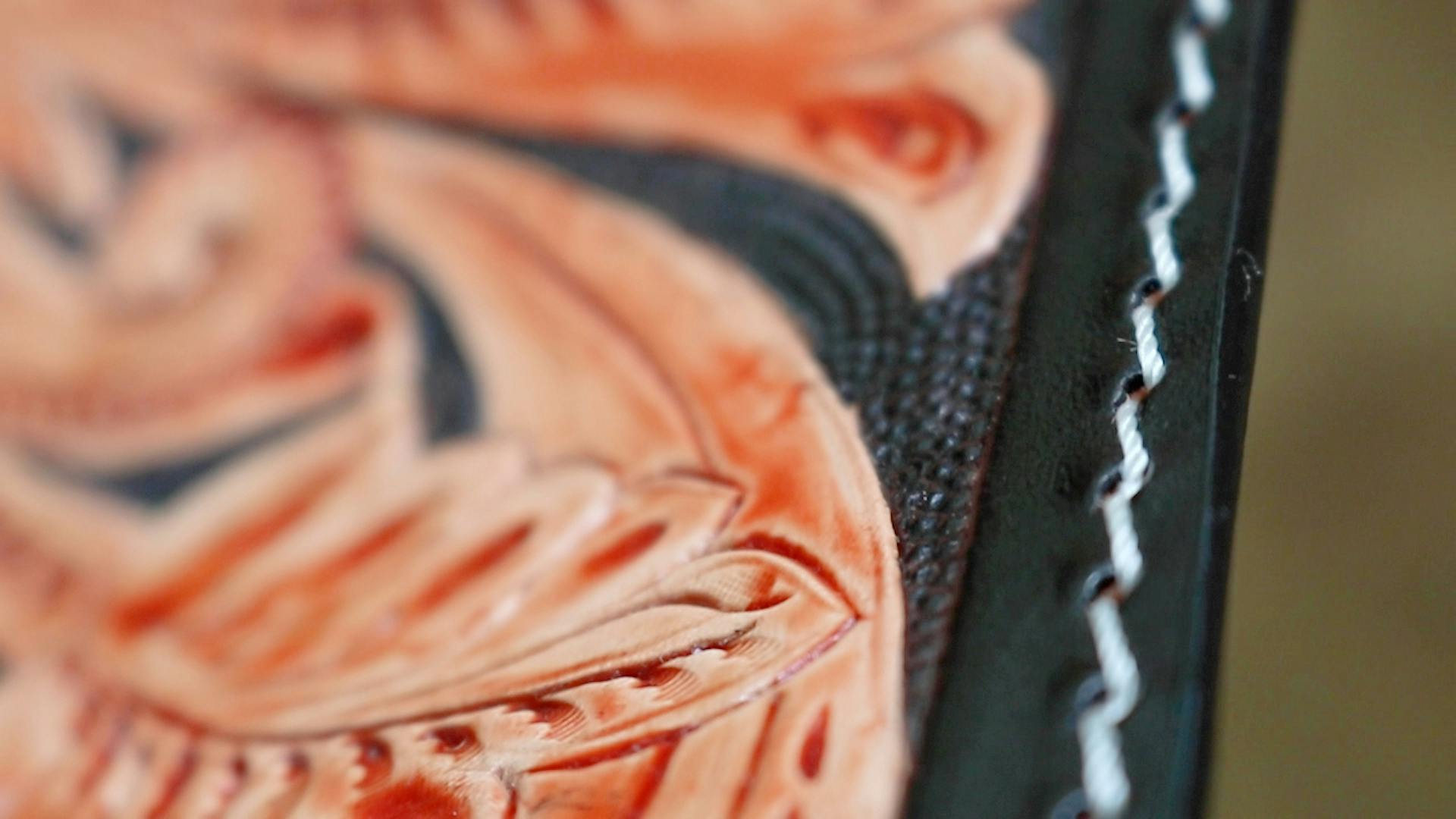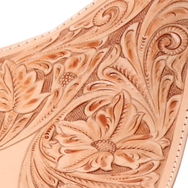 本革に美しく力強く刻まれた、ボタニカル柄のカービング彫刻。