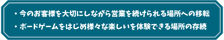 これまでも当店を好きでいてくれる方はもちろん、これから多くの楽しいを感じていただく方のため、何よりボードゲームを好きな自分たちのために、この店を続けたいそんな一心です。