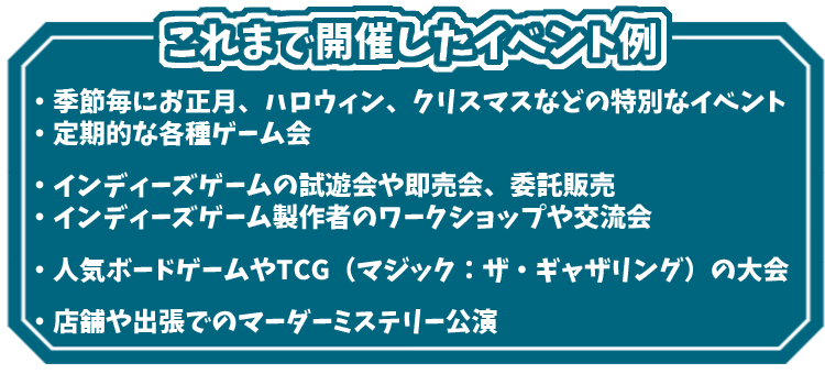 ボードゲーム以外にも話題のマーダーミステリーや謎解き、様々なイベントなどでも遊んでもらえるお店です。