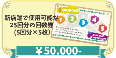 ・新店舗で使用可能な25回分回数券(5回分×5枚セット)+お礼のメール 50,000円