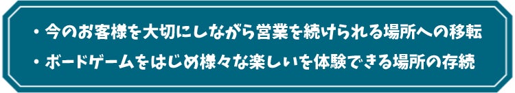 ボードゲームショップギルドの新店舗移転費用と再オープンまでの店舗維持費に充てさせて頂きます。