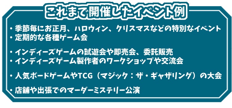 ボードゲーム以外にも話題のマーダーミステリーや謎解き、様々なイベントなどでも遊んでもらえるお店です。