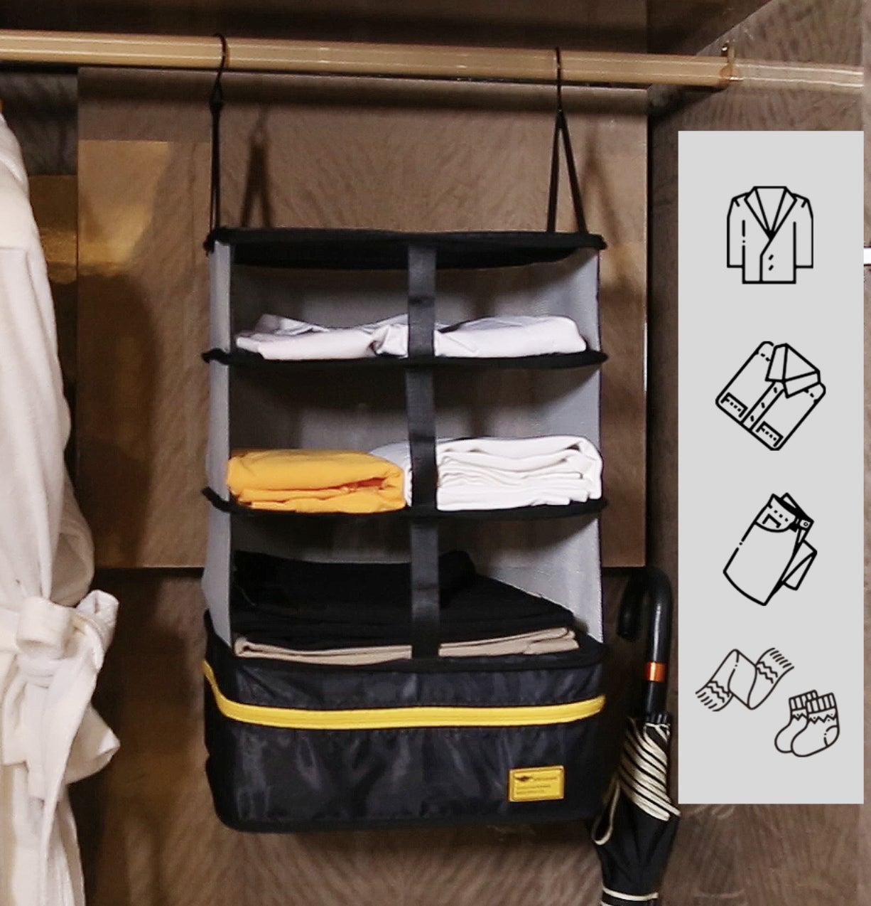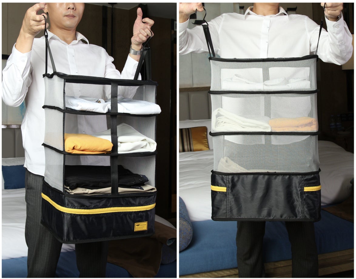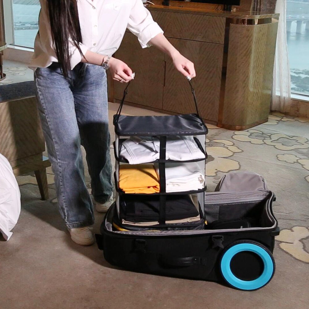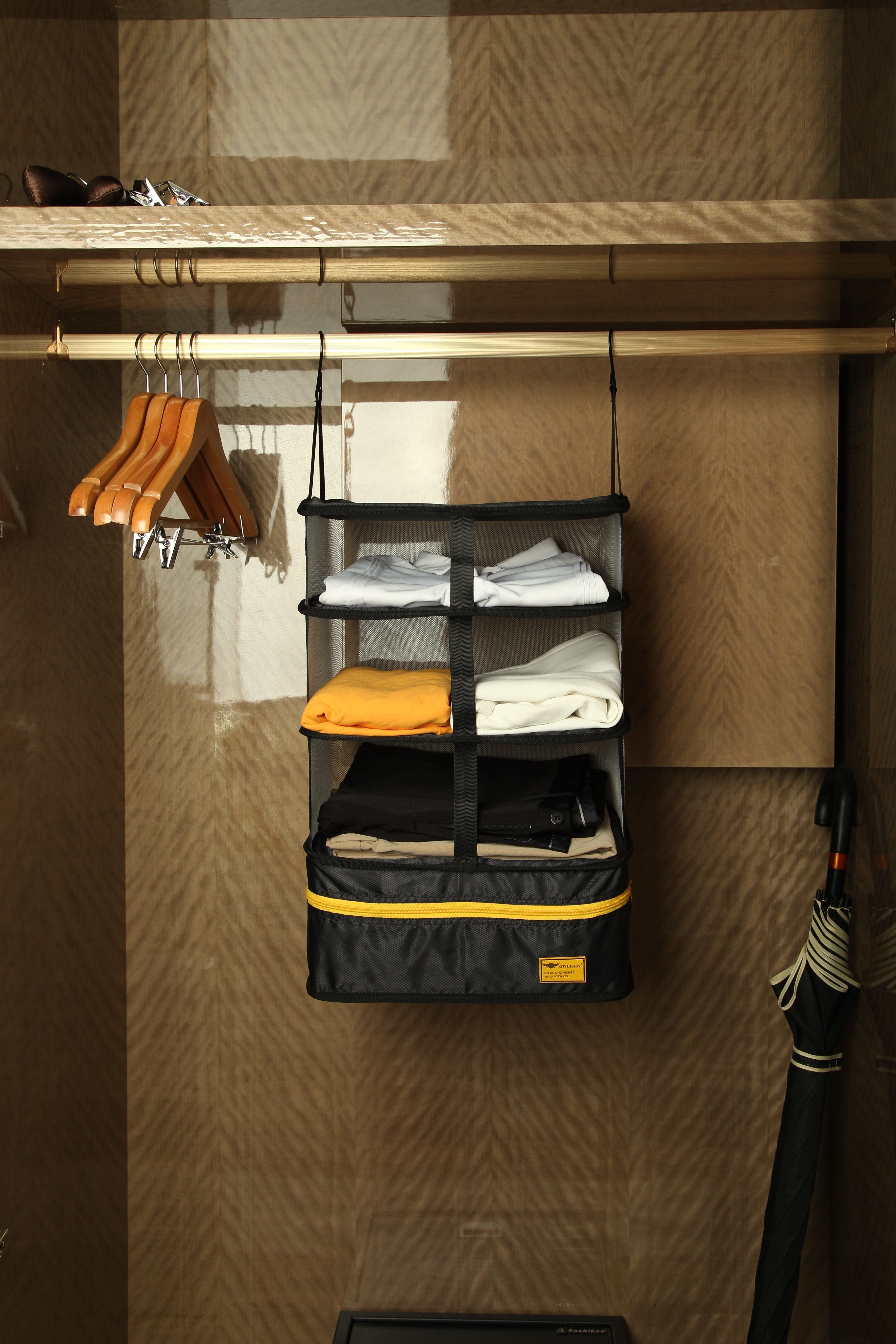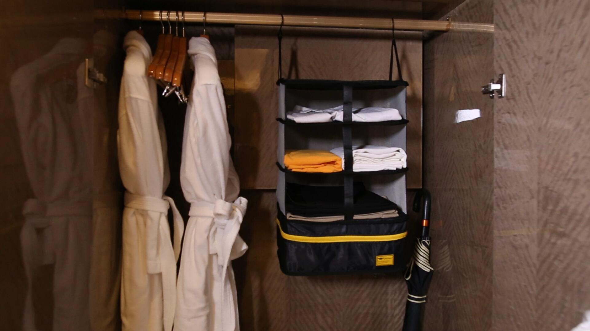 「楽々収納バッグ」は旅行・出張先のホテルで吊り下げ型の収納バッグに変身します!スーツケースからそのまま取り出すことができます。