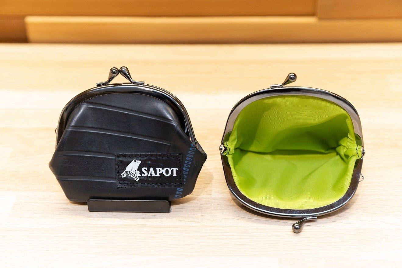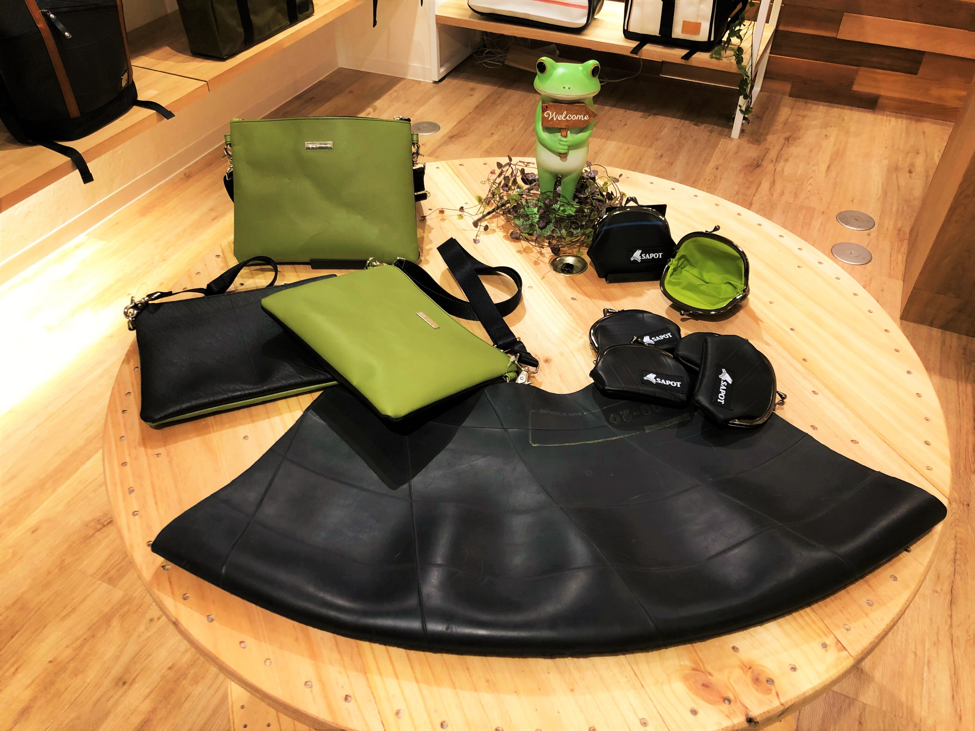↑廃タイヤチューブが、サコッシュとがま口に生まれ変わりました。