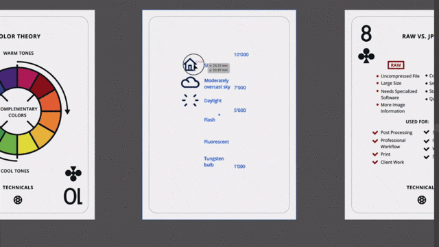 "The Photography Deck”では、カメラ・写真・撮影に関する最も重要なエッセンスを4つのカテゴリに分けて、絵柄(スート)ごとにわかりやすく掲載しています。