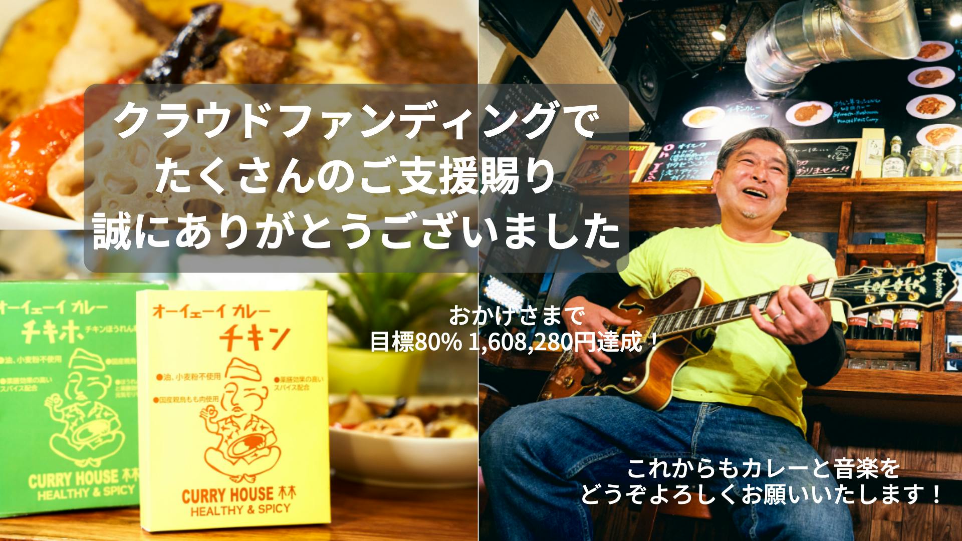 2021/03/24 11:30たくさんのご支援ありがとうございます! 皆さまのご厚情に心より感謝いたします!この度は「カレーハウス林 支援プロジェクト」にご協力を賜り誠にありがとうございます。おかげさまでたくさんの皆様より支援をいただき、目標額の80%の1,608,280円に達することができました。多くの援助をいただいたことで、クラウドファンディングと同時進行となった新規事業のレトルトカレー開発もよりスムーズに進めることができ、皆さまにはいくら感謝してもしきれない思いです。皆さまに助けていただいたご恩を、今後「美味しいカレー」と「音楽」でお返していきたいと決意を新たにしています。これから皆さまへのリターン送付を早急に進めてまいります(4月上旬発送開始予定)。新開発のレトルトカレーや店舗で使えるクーポンなど、ぜひご活用いただけましたら幸いです。またレトルトカレーをお試しいただいた方は、後日お味の感想などをお聞かせいただけましたら大変助かります。なお三田・田町の店舗も、時短により月曜~土曜の昼営業のみ営業しておりますので、ご都合あわれます時にぜひ足をお運びいただけましたら嬉しく存じます。音楽イベントも状況を見ながら少しずつ再開していきたいと考えています。これからも皆さまに元気をお届けすべく精進してまいりますので、当店のカレーと音楽を今後もご愛顧いただけますようよろしくお願いいたします。皆さまがコロナ禍に負けず、健やかな毎日を過ごされることを心より願っています。ありがとうございました。カレーハウス林の味を皆さんのお手元へ!オーイェーイカレーのネット通販を4月上旬より開始します!皆さまへのリターン送付と同じタイミングで(4月上旬予定)、新開発のレトルトカレーや冷凍カレーを、各種モールや当店ホームページからご購入いただけるようになります。ご来店がむずかしい方も、これからはご自宅やさまざまな場所で、カレーハウス林の独自の味をお楽しみいただくことができます。ぜひご贔屓賜ることができましたら幸いです。●オーイェーイカレーのご購入先ヤマダモール 楽天モール wowmaモール(au PAY)※後日リンクをお知らせします●デリバリーご依頼はこちらからUberEatshttps://www.ubereats.com/jp/tokyo/food-delivery/%E3%82%AB%E3%83%AC%E3%83%BC%E3%83%8F%E3%82%A6%E3%82%B9%E6%9E%97-curryhouse-hayashi/UVoz34ZMTsmFXBvwAHJjig?pl=JTdCJTIyYWRkcmVzcyUyMiUzQSUyMiVFOCU4QSU5RCVFNSU4NSVBQyVFNSU5QyU5MiUyMiUyQyUyMnJlZmVyZW5jZSUyMiUzQSUyMkNoSUphWXQ5M2I2TEdHQVJSVHQzWTdZa3FWZyUyMiUyQyUyMnJlZmVyZW5jZVR5cGUlMjIlM0ElMjJnb29nbGVfcGxhY2VzJTIyJTJDJTIybGF0aXR1ZGUlMjIlM0EzNS42NTQ5MzgwMDAwMDAwMSUyQyUyMmxvbmdpdHVkZSUyMiUzQTEzOS43NDc5ODM3JTdE出前館https://foodneko.com/companyフードネコhttps://demae-can.com/shopDetail/3106809●店舗についてカレーハウス林ホームページ curryhouse884.com105-0014 東京都港区芝3-32-14上野ビル1Ftel 03-6435-0774 JR田町駅より6分/都営三田線三田駅より4分 平日ランチ 11:30~15:00 平日ディナー 18:00~21:00(20:30L.O.) ディナーイベント(随時)19:30~22:00 土曜ランチ 11:30~15:00 定休日/日曜・祝日 ※パーティ・イベントは休日でも承りますのでご相談ください。 ※時短要請期間はオープン時間が変わります。上記ホームページをご参照ください。 もっと見るプロジェクト終了まで1週間