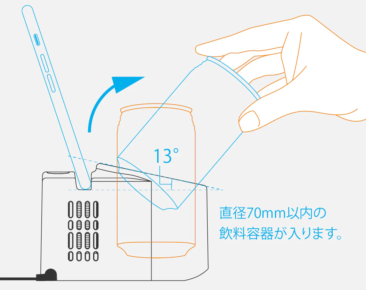 本体は緩やかな台形になっていますので外部からの衝撃による転倒に強く、取り出し口に13°の傾斜をつけてドリンクを取り出しやすくしたデザインも特徴です。