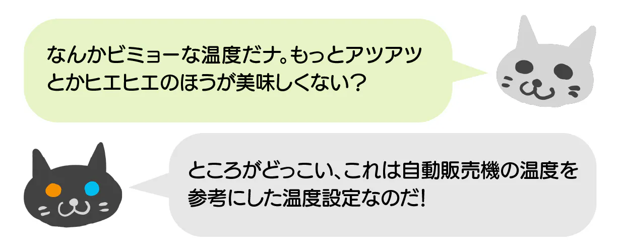 自動販売機の温度はHOTが約55℃、COLDが約5℃、この温度は人が美味しいと感じる温度帯(人体温度±25℃前後)を参考に設定されています。自販機と全く同じ温度、とはいきませんが、なるべく近くなるようにと設計しました。