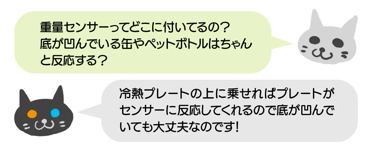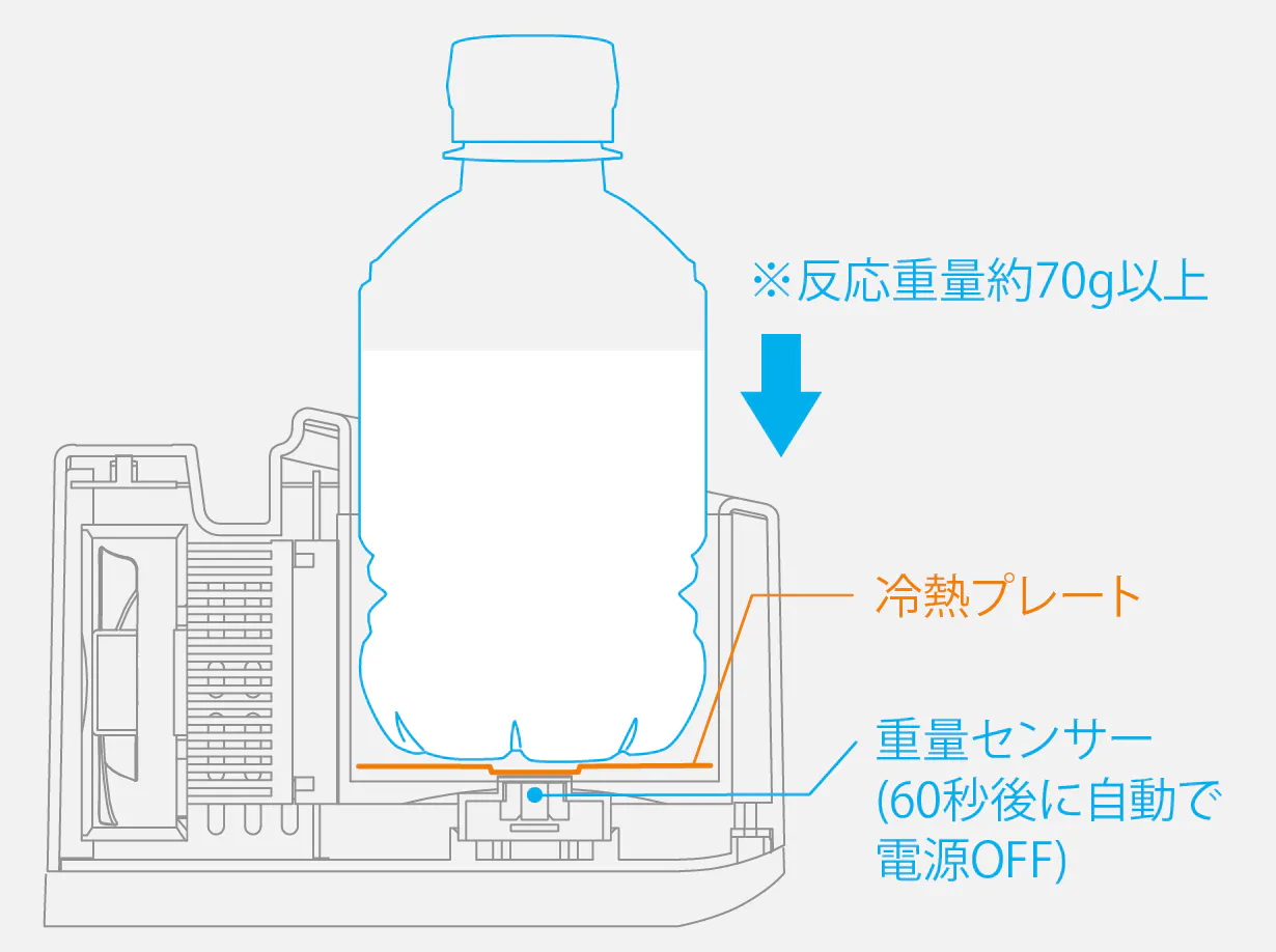 ※目安として、容器を含めた総重量約70g以下(350mlのアルミ缶ですと内容量約60ml以下)になると反応しなくなり、電源がOFFになります。