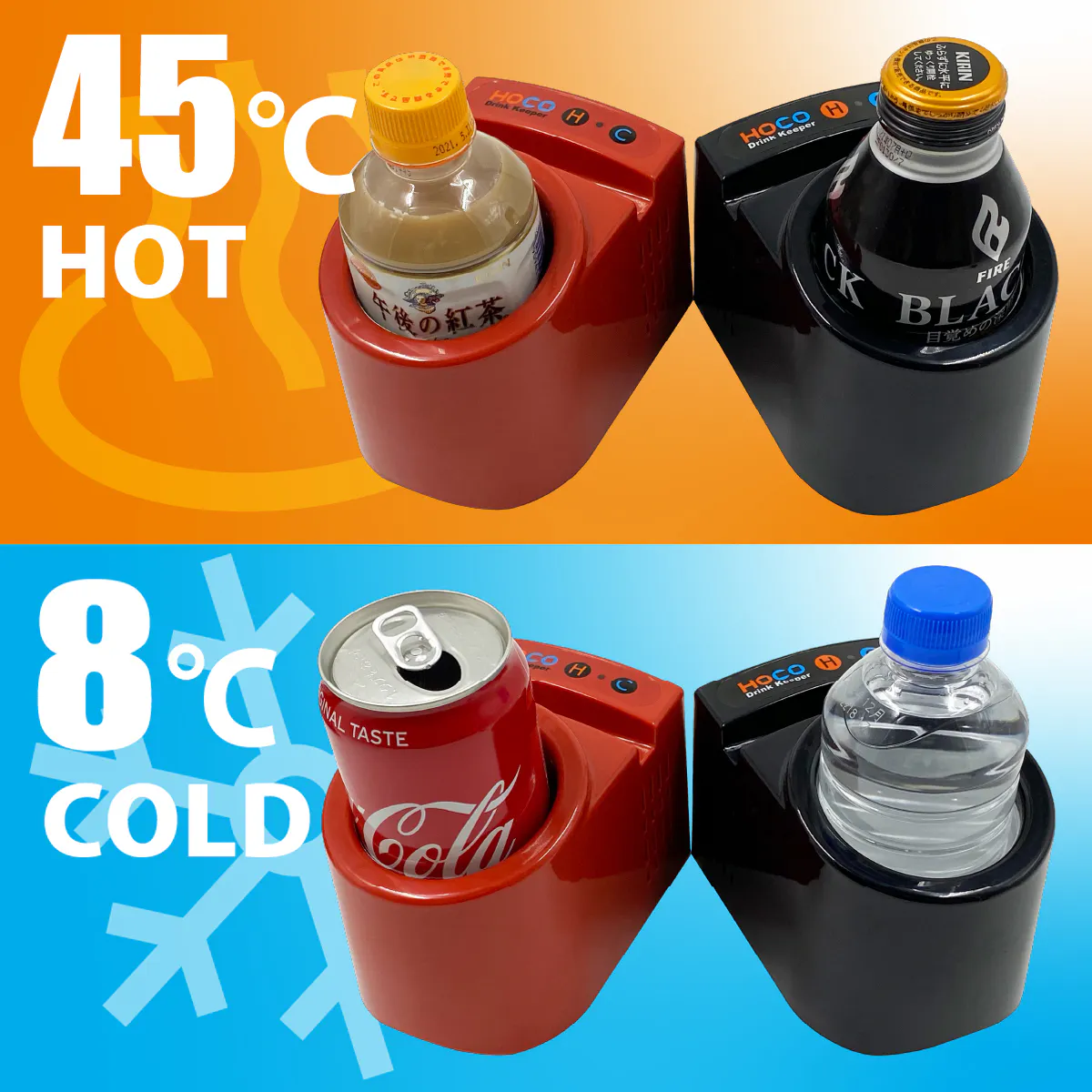 保温冷機能付きドリンクホルダー「HOCO」は、保温は約45℃前後、保冷は約8℃前後で稼働します。従来の卓上ドリンクウォーマー(保温)機能だけでなく、クーラー(保冷)機能もついているので1年間365日活躍できるドリンクホルダーです。