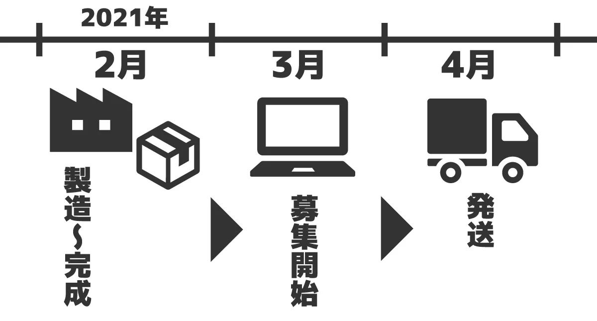 皆様をお待たせすることはございません!…が、募集数が予定数を上回った場合、発送が1〜2か月ほど遅延する可能性がございます。どうぞご了承ください。
