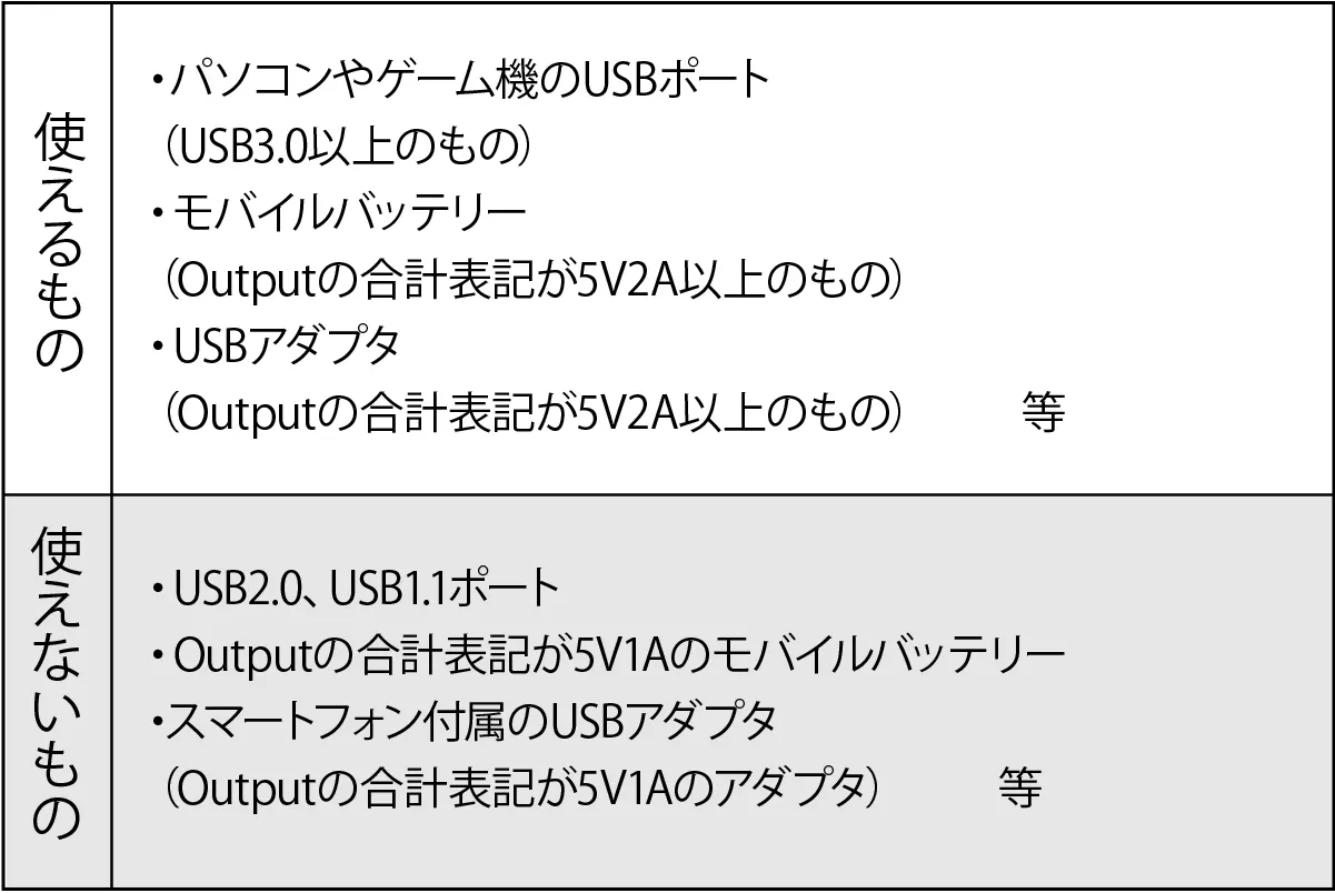 A. 出力(Output)が合計で5V2A以上のモバイルバッテリーならご使用いただけます。また、一般的なモバイルバッテリーですと、バッテリーセルの出力電圧が3.7Vなので、5Vで使用する場合は昇圧を行うため、使用できる電流は表示されている数値のおよそ60~70%になります。