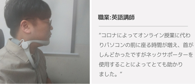A:ネックサポーターを使用し、正しい姿勢に合うようパソコンモニターの高さも調節しました。 以前は下げて見るのが楽でしたが、今は座るときに真っ直ぐ正面から見えるように直しました。 姿勢を正しつつ、正面からでも画面を見やすくするために、ネックサポーターが大きな助けになりました。
