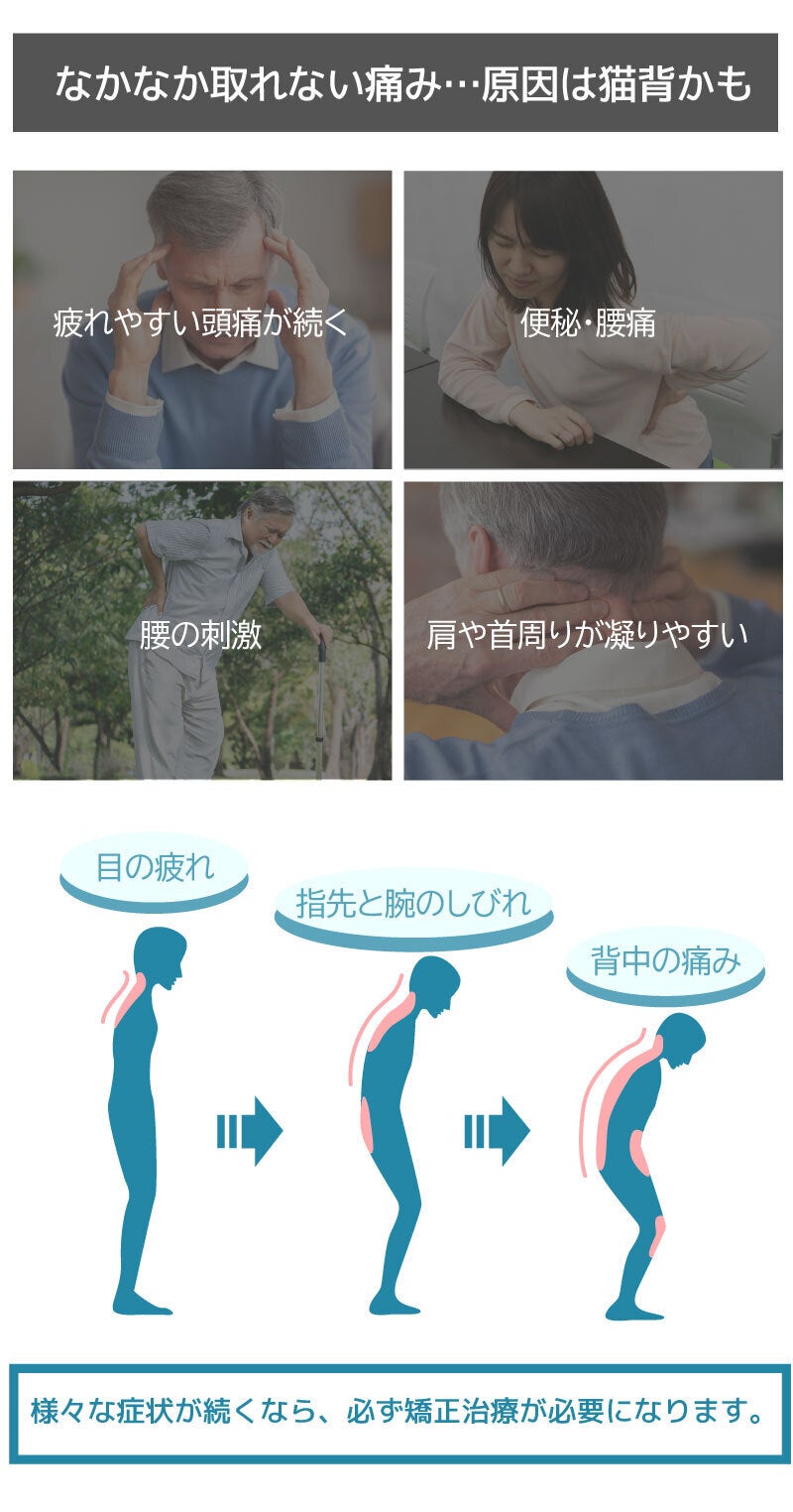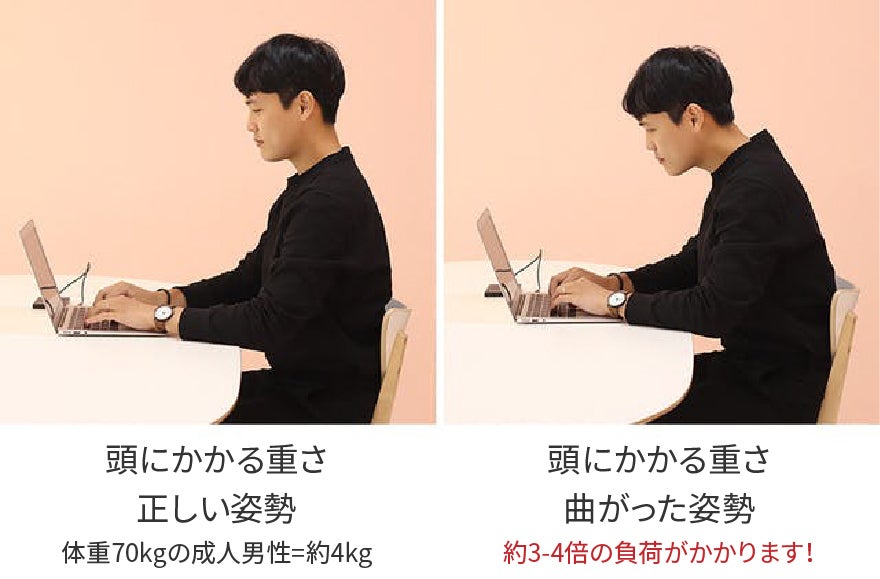 背中が曲がっていればいるほど、首はより大きな重さを耐えなければならず、負担はますます大きくなります。