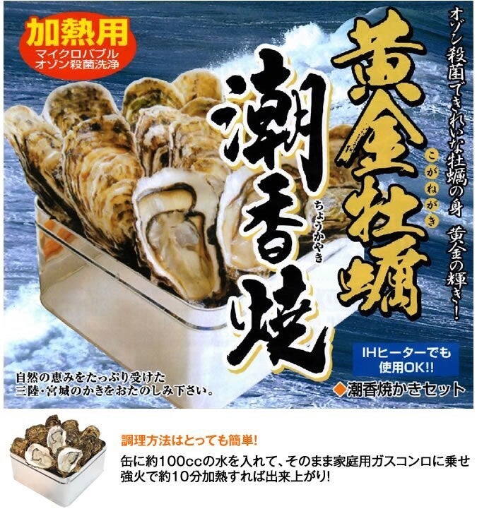 黄金牡蠣潮香焼セットは、缶のままコップ1杯ほどの水を入れコンロで加熱するだけで、自宅に簡単に牡蠣小屋気分の蒸し焼きが楽しめます。