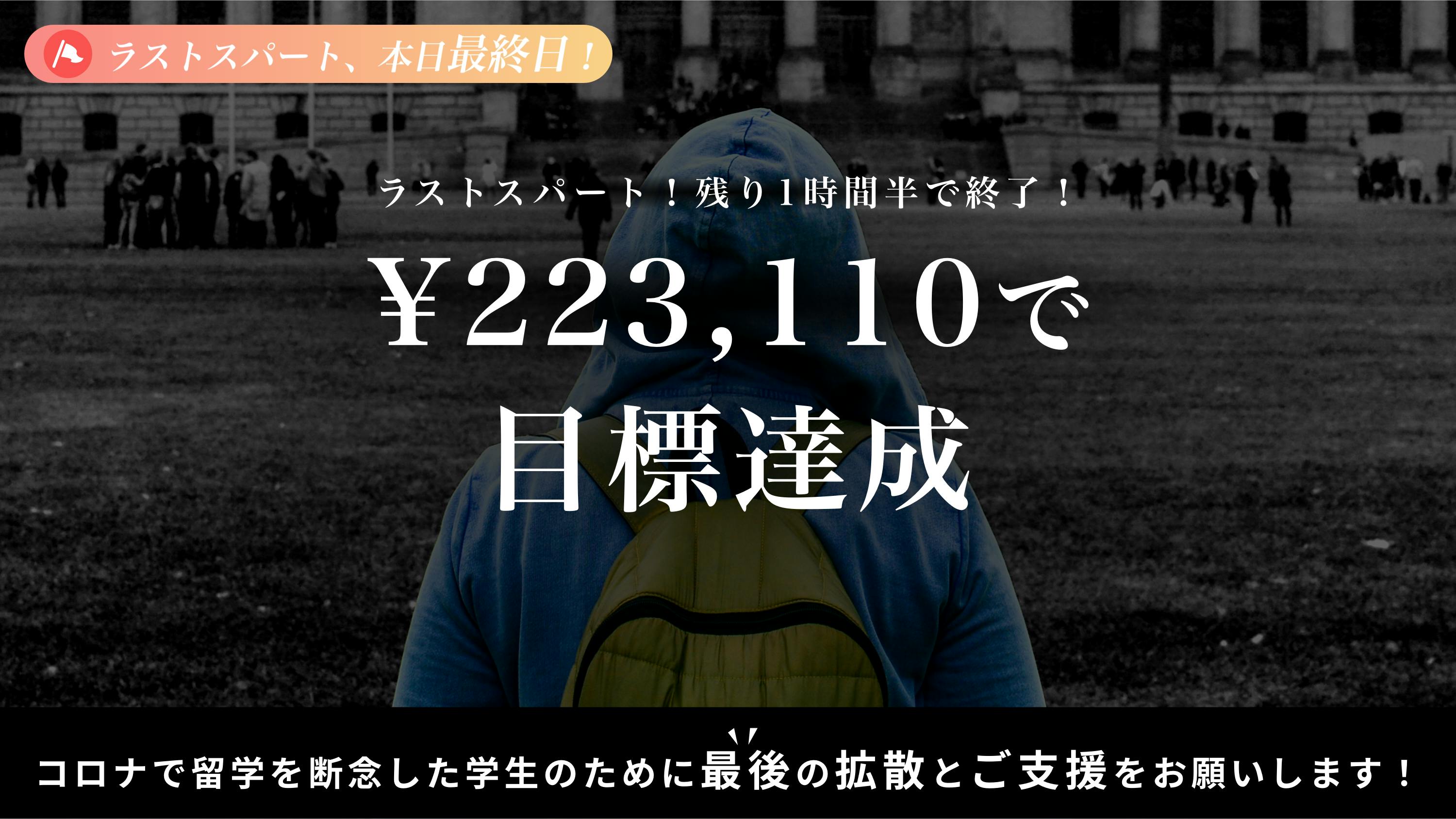 2021/02/27 22:37沢山の方々にご支援頂いた「#留学を止めるな」クラウドファンディングですが、残り1時間半で終了になります!現在の支援総額:2,776,890円支援者数:203人皆様のおかげでここまで来れました!ラストスパート、最後までよろしくお願い致します!! もっと見る