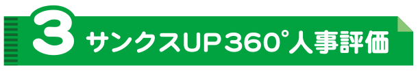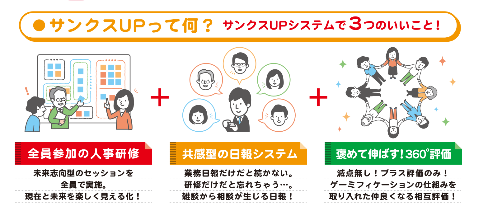 サンクスUPは(1)人事研修、(2)360°評価、(3)日報システムの3つから構成される人材共育・社風づくりの総合ソリューションです。