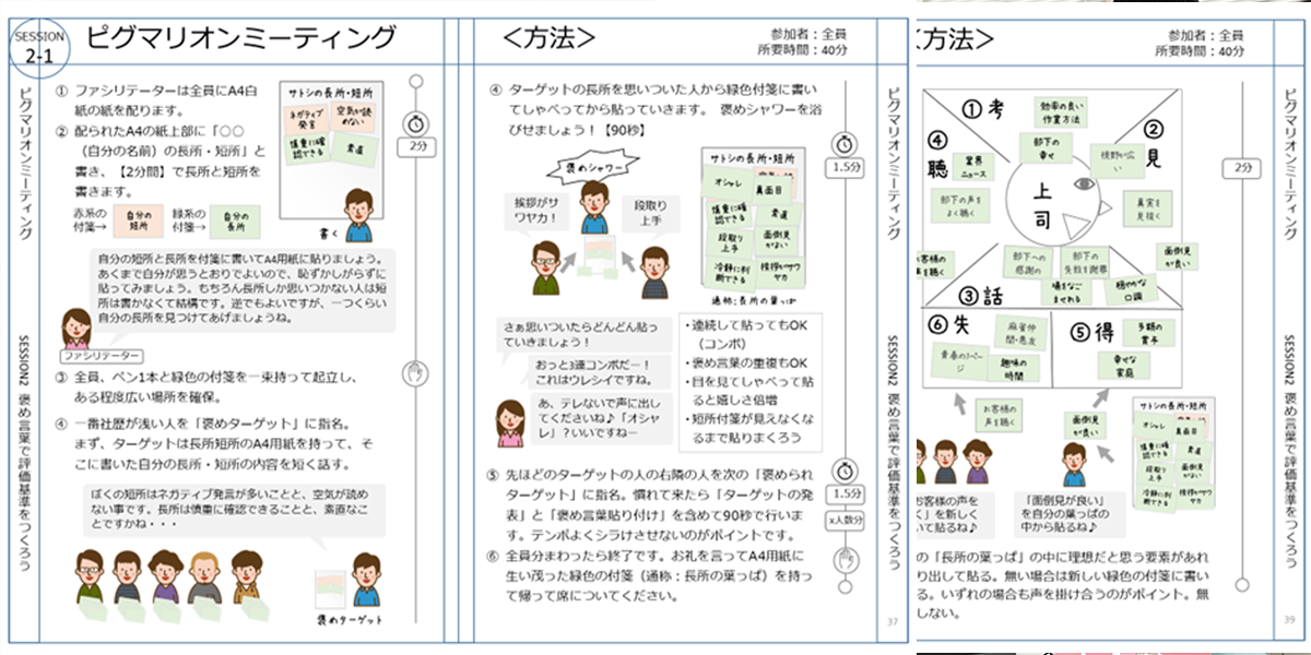 現在と未来の『タスク』に対して必要な『スキル』を明らかにします。そして、社員同士でとことん褒め合う『褒めシャワー』を浴びせ、理想の社員像(理想の上司、理想の新人)をみんなでイメージします。
