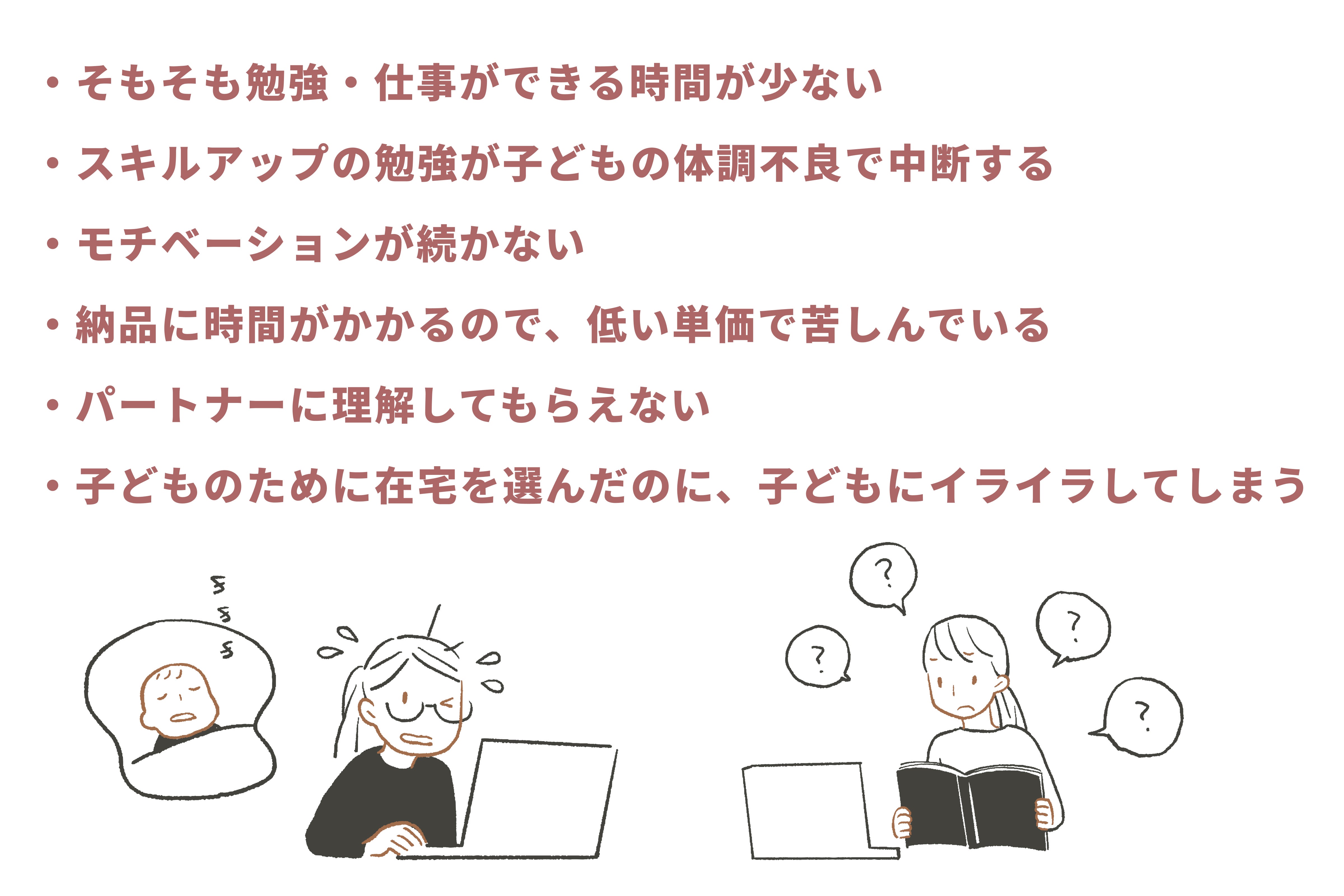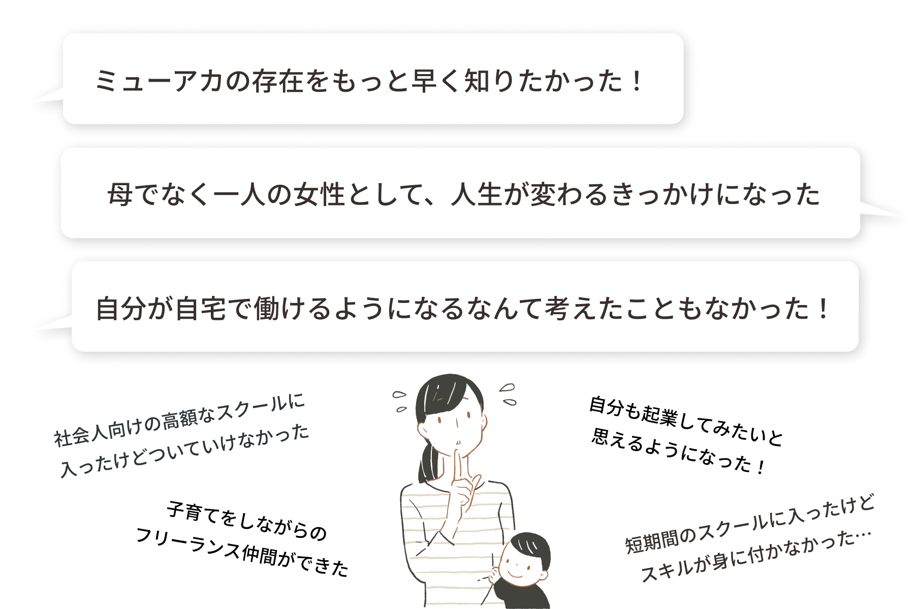 ミューアカをつくるにあたり、ヒアリングさせて頂いたママたちからは「頑張って自己投資をしてスキル習得をしたのに、結局仕事につながらない…!!」というリアルなお声をいただきました。