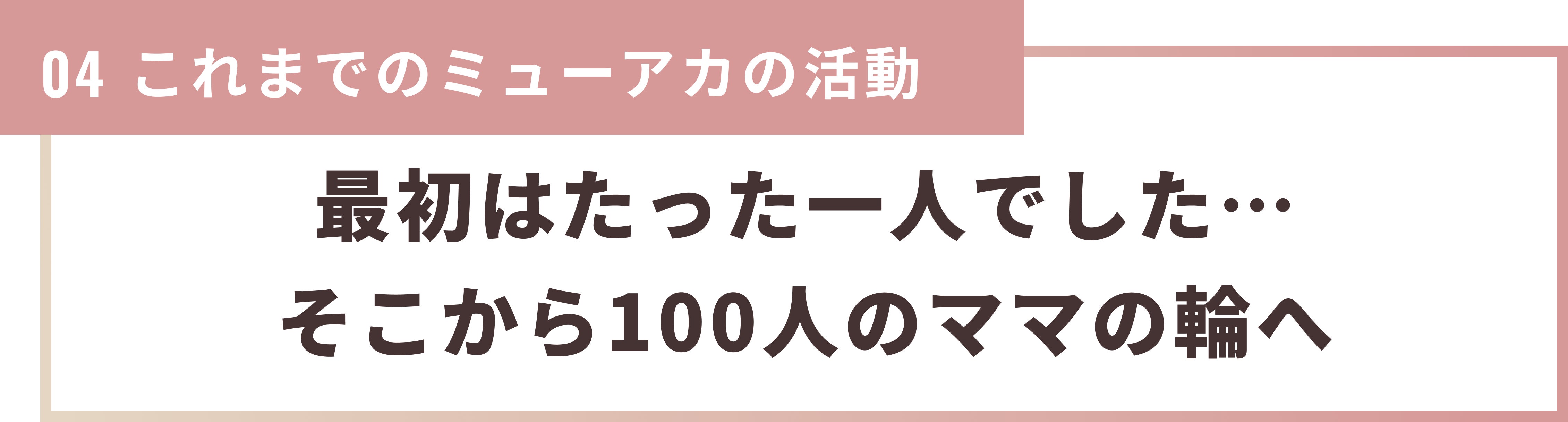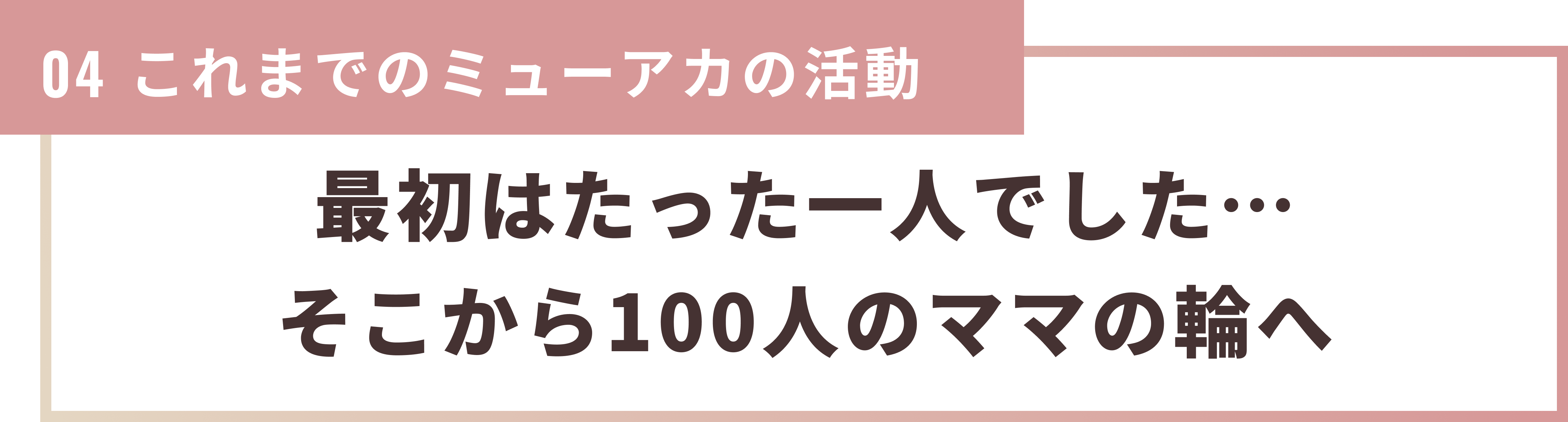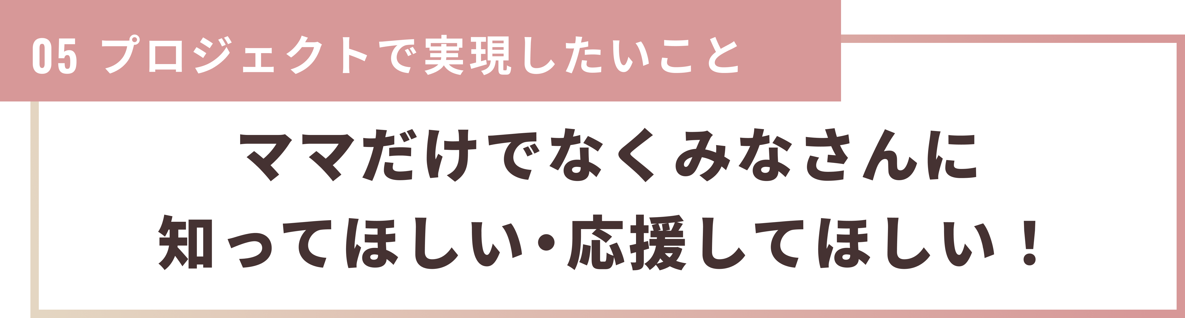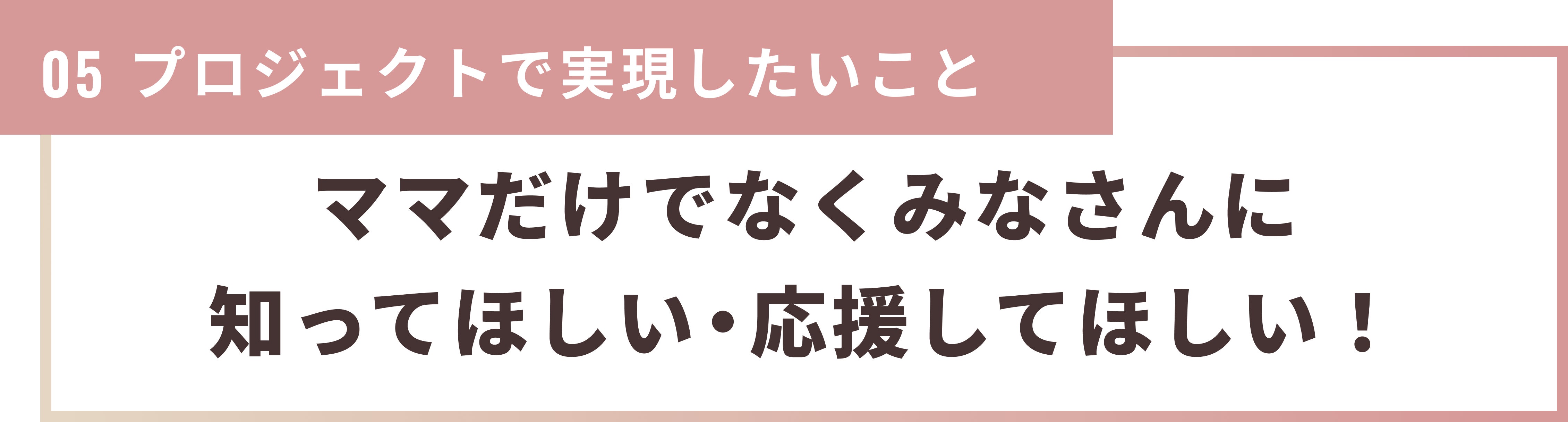 このプロジェクトを通じて私たちが実現したいことは、ミューアカを日本中のママたち(パパたちにも!)に知ってもらうということだけではなく、少しでも心が動いたなら、「自分にもできるかもしれない」そう思ったなら、一緒に挑戦する仲間・応援してくださるサポーターになってもらうことです。