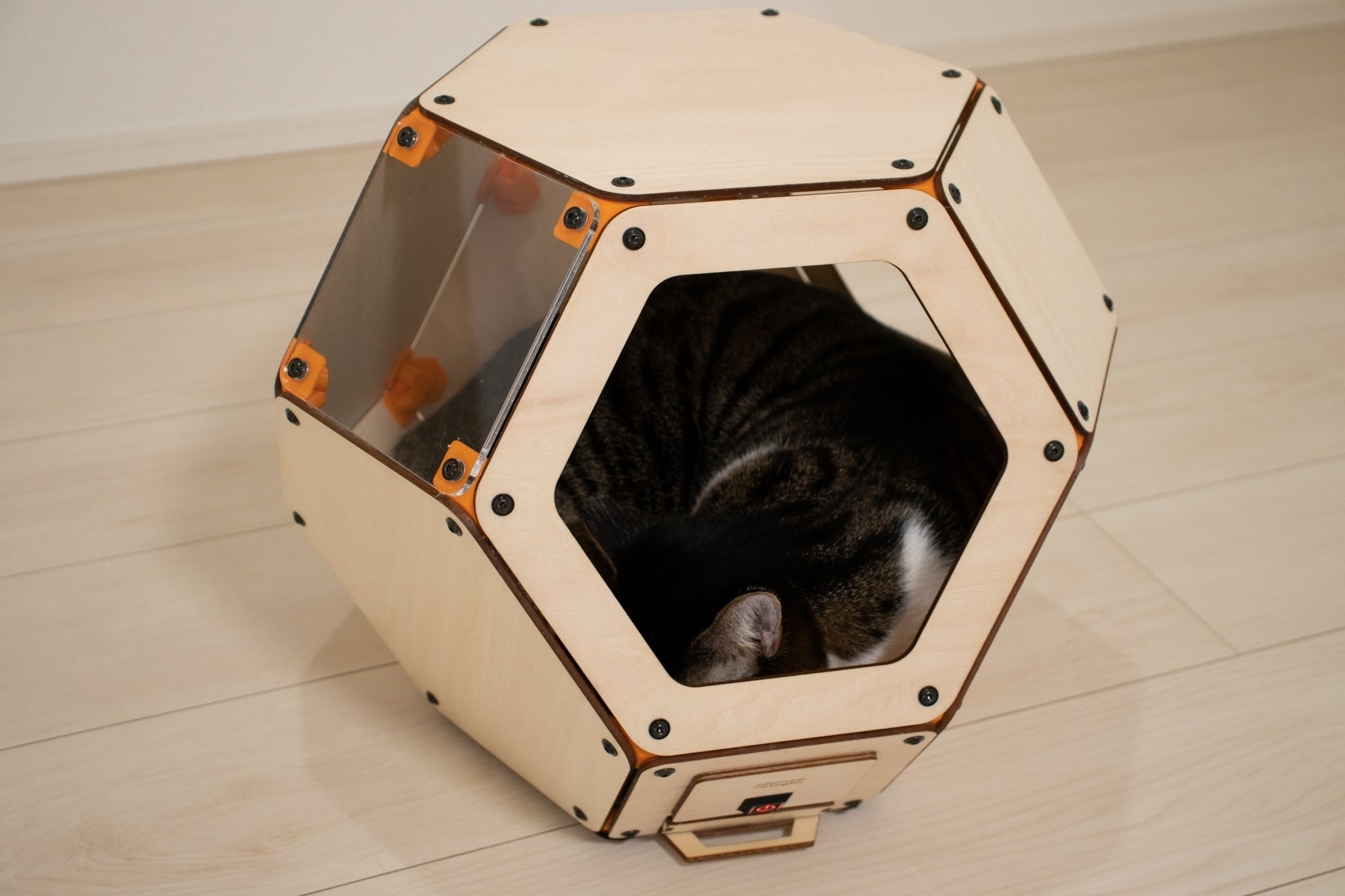 素材は木材だけでなく、2面はアクリル製の窓がついています。猫さんは周りの様子がわかるので安心。飼い主さんも猫さんの様子を外から確認できるので安心です。